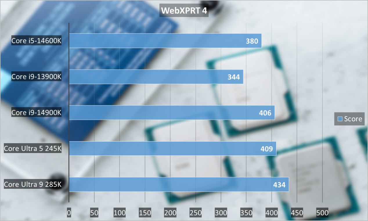 WebXPRT 4与CrossMark同样也非常看中CPU的整体性能表现,在WebXPRT 4是基于浏览器的基准测试工具,旨在评估设备在执行常见Web应用程序任务时的性能,因此也更注重CPU的表现。这里可以看到酷睿Ultra 9 285K相对酷睿i9-14900K提升6%。酷睿Ultra 5 245K相对酷睿i5-14600K提升则在7%左右。