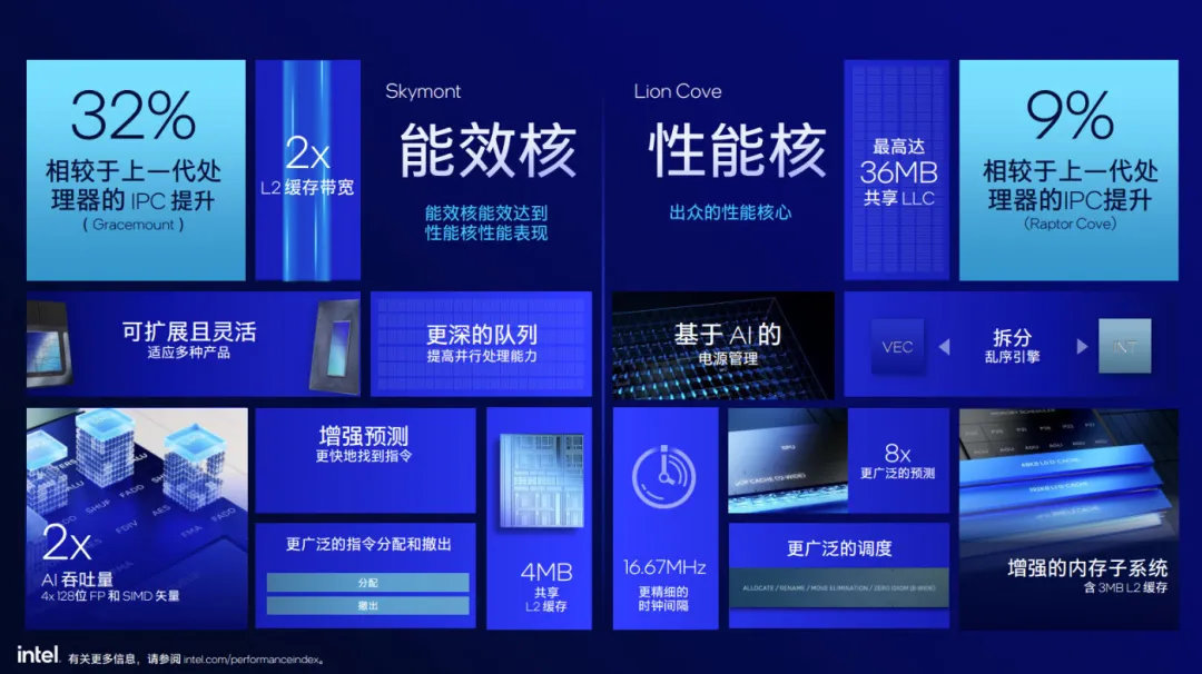E-Core部分Skymont也使用了全新的设计。包括在一个时钟周期内同时解码并执行9条指令,也就是9宽解码,比上一代E-Core的Crestmont架构增加了50%。通常而已,解码阶段的宽度越大,处理器的性能越高,可以更有效地利用其资源,加快指令的执行速度。并且功耗效率得到了明显提升,单线程性能提升1.7倍的情况下,功耗仅为Meteor Lake LP E-Core的三分之一。