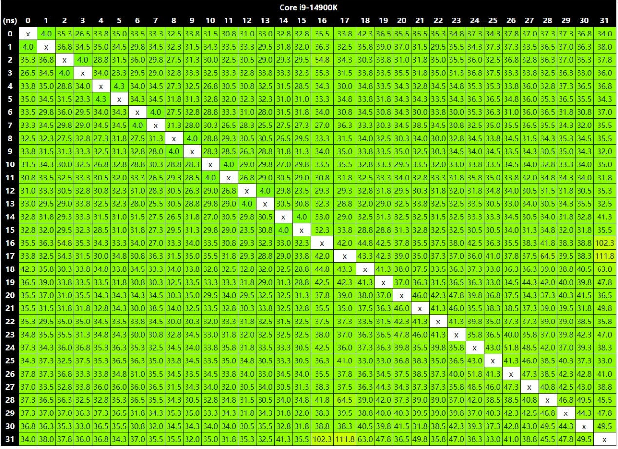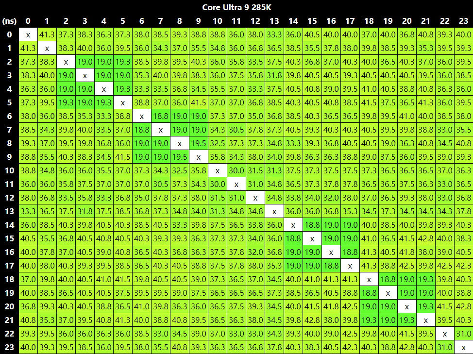 另外从核到核的延迟表现来看,酷睿Ultra 9 285K的C2C延迟表现不错,不过核心延迟之间已经很难作为性能参考的因素,这里仅做参考。