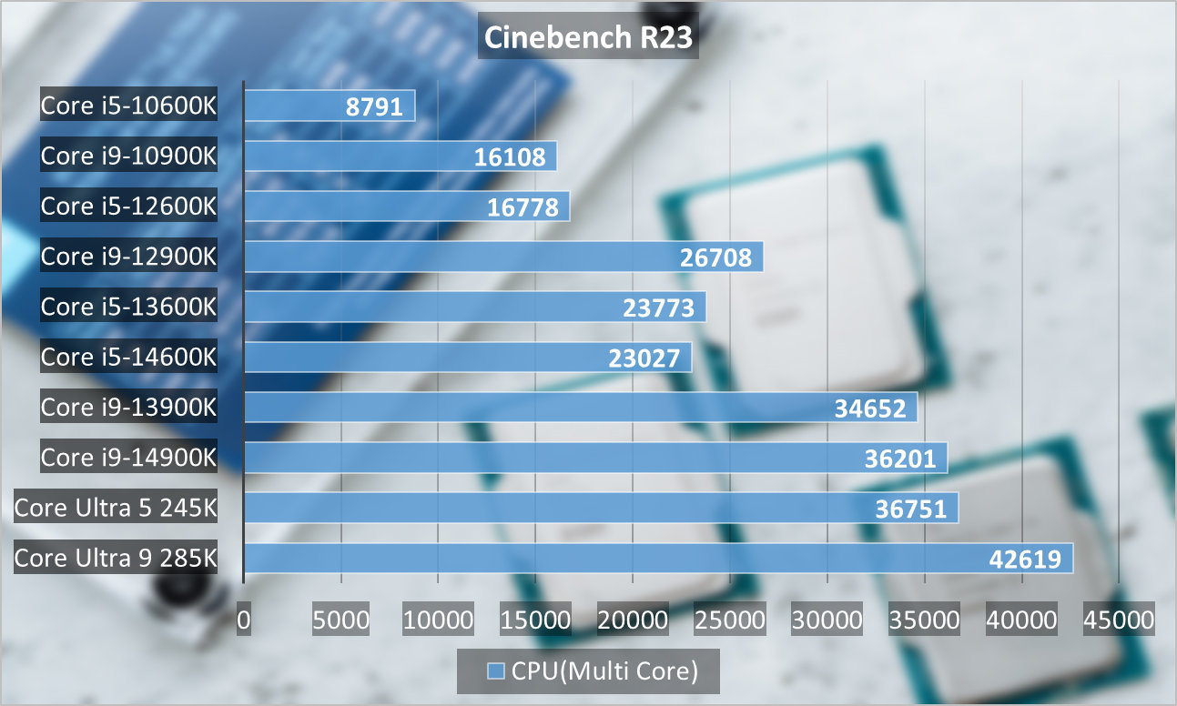 多线程测试部分我们引入Cinebench R23作为参考, 酷睿Ultra 9 285K相对酷睿i9-14900K提升明显,多线程性能提升达到了17%,酷睿Ultra 5 245K相对酷睿i5-14600K多线程提升大概在6%这样。