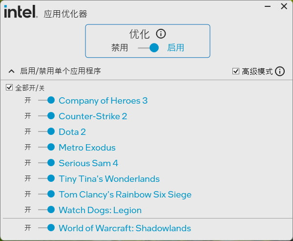 另外值得一说的就是英特尔应用优化器(Intel Application Optimization,APO)支持更多的游戏。APO是一个现有硬件线程调度器配合,给游戏和应用提供更好的技术,它需要基于Dynamic Tuning Technology(DTV)运行,也需要游戏支持,因此在推广上需要花费更多时间。从最新的APO中,我们可以直观的APO目前支持的游戏。包括Dota2,地铁:离去,彩虹六号等等。