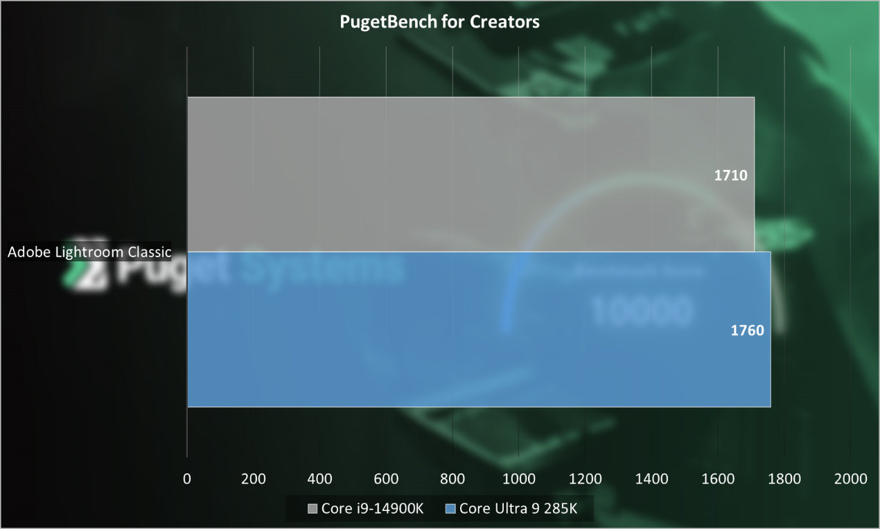 在PugetBench for Creators - Adobe Lightroom Classic中,酷睿Ultra 9 285K相对于酷睿i9-14900K提升2%。