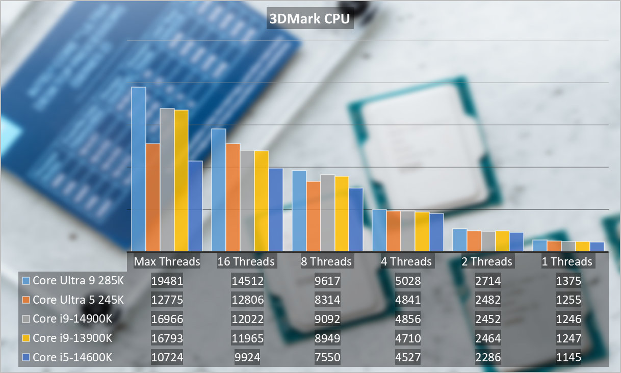 在3DMark CPU基准测试中,可以看到酷睿Ultra 9 285K单线程有了明显的提升,相对酷睿i9-14900K有10%的提升,而多线程表现则更为明显,酷睿Ultra 9 285K相对酷睿i9-14900K提升了14%。