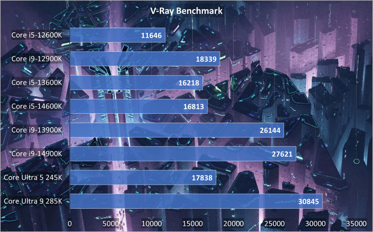 V-Ray Benchmark中,酷睿Ultra 9 285K相对酷睿i9-14900K提升11%,酷睿Ultra 5 245K相对酷睿i5-14600K提升6%。