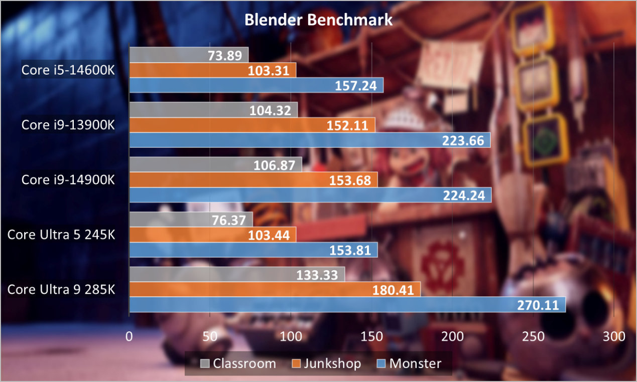 渲染输出也同样是考验处理器性能上的综合表现,在Blender Benchmark中,可以看到,酷睿Ultra 9 285K相对酷睿i9-14900K提升有20%以上。不过酷睿Ultra 5 245K相对酷睿i5-14600K提升不大,处于基本持平的状态。