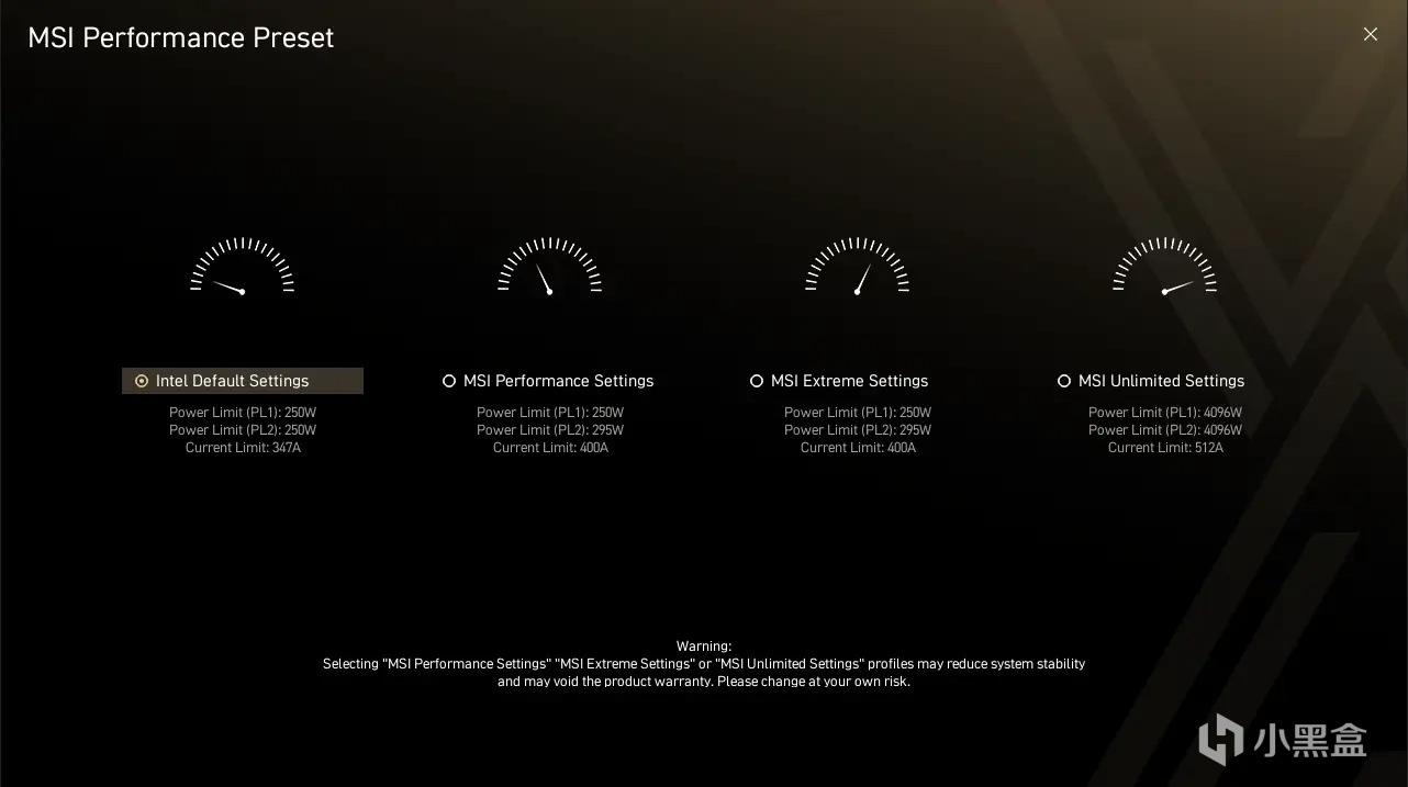因爲13代14代處理器的影響,微星MEG Z890 ACE主板的BIOS默認預設爲Intel Default Settings,不過微星也給出了三個檔位可選,其中性能全開的就是MSl Unlimited Settings。
