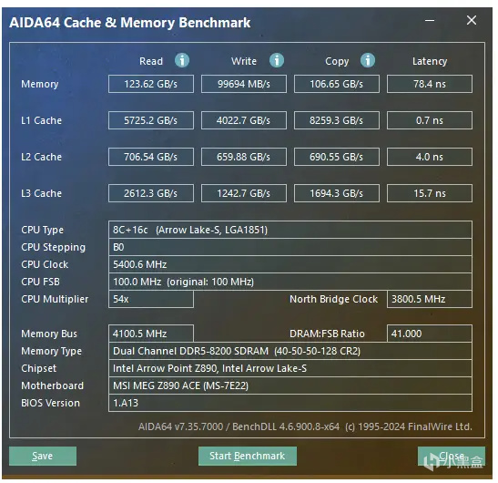 實測開啓XMP,8200MT/s頻率下(時序40-50-50-128),該內存的性能測試成績如下: