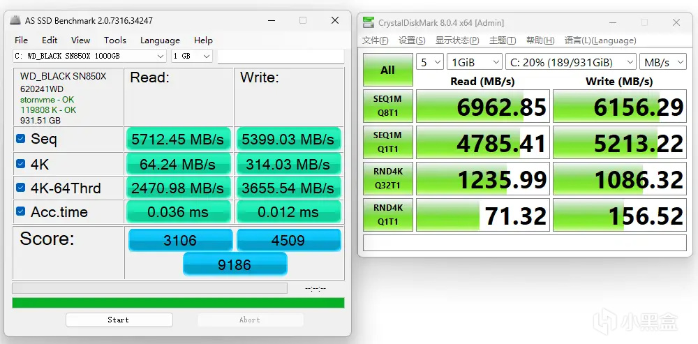 AS SSD給出的評分爲9186,其中順序讀取速度爲5712.45MB/s,順序寫入速度爲5399.03MB/s,4K隨機讀取速度爲64.24MB/s,4K隨機寫入速度爲314.03MB/s。