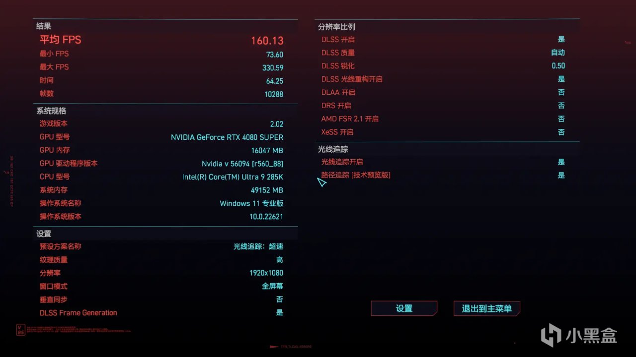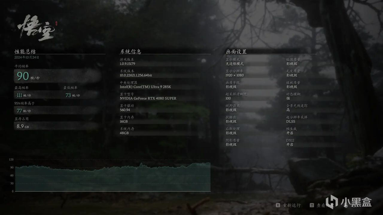 1080P分辨率+影視級畫面設置+DLSS 3.0+超採樣清晰度100,遊戲測試下來平均幀數爲90FPS(最高爲111FPS,最低爲73FPS),實際遊戲中的表現也相差無幾。