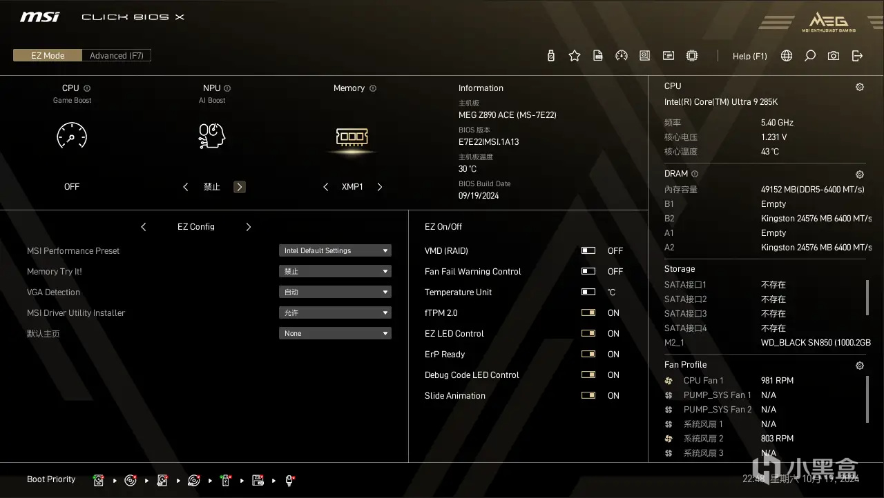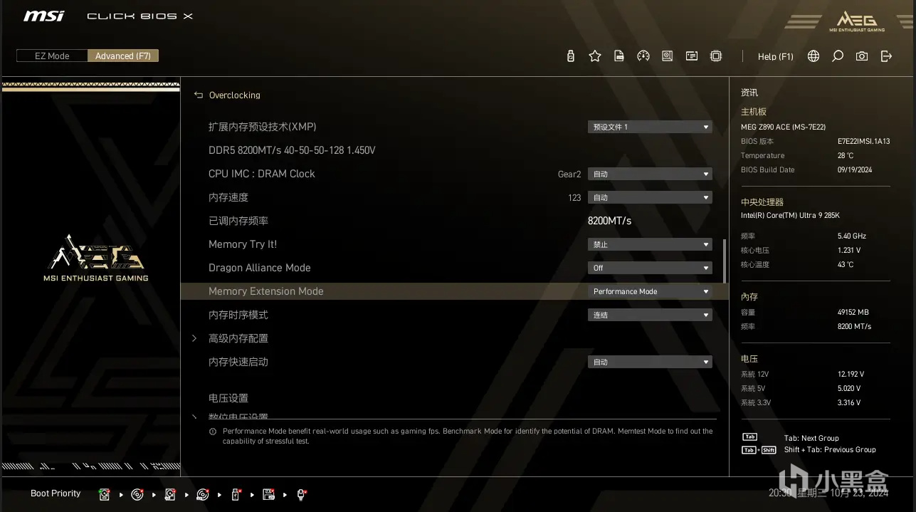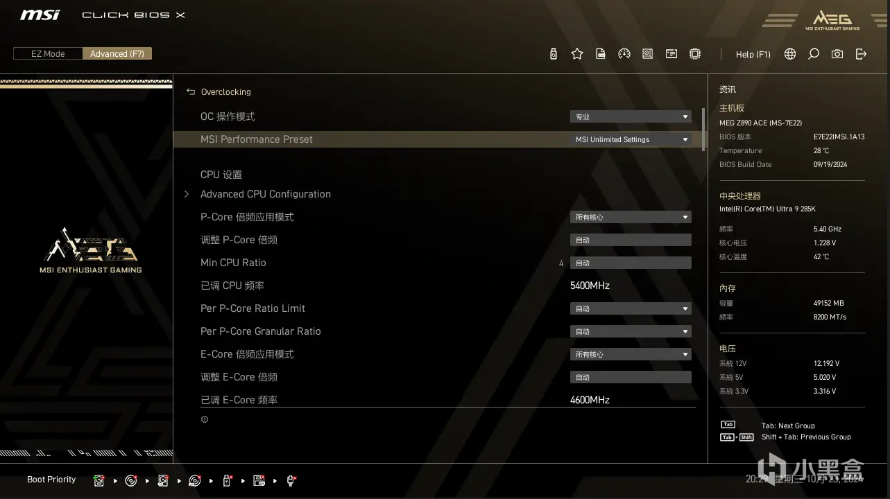 主板:微星MEG Z890 ACE(BIOS使用MSl Unlimited Settings)