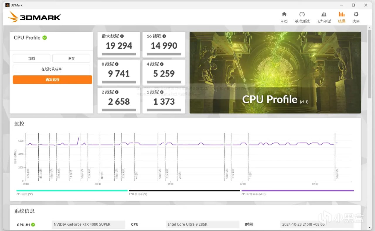 3DMARK CPU Profle測試,單線程爲1373,2線程爲2658,4線程爲5259,8線程爲9741,16線程爲14990,最大線程爲19294。