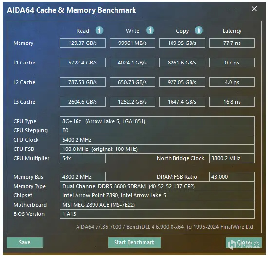 開啓Dragon Alliance partner+Performance Mode後,內存頻率達到了8600MT/s(時序爲40-52-52-137)。這時候讀取速度爲129370MB/s,寫入速度爲99961MB/s,複製速度爲109950MB/s,延遲爲77.7ns。