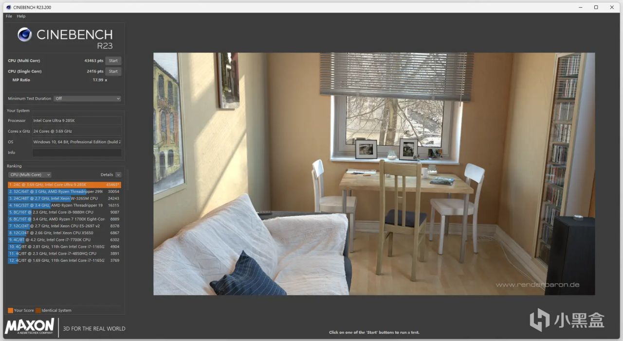 CINEBENCH R23測試,單核成績爲2416pts,多核成績爲43463pts。