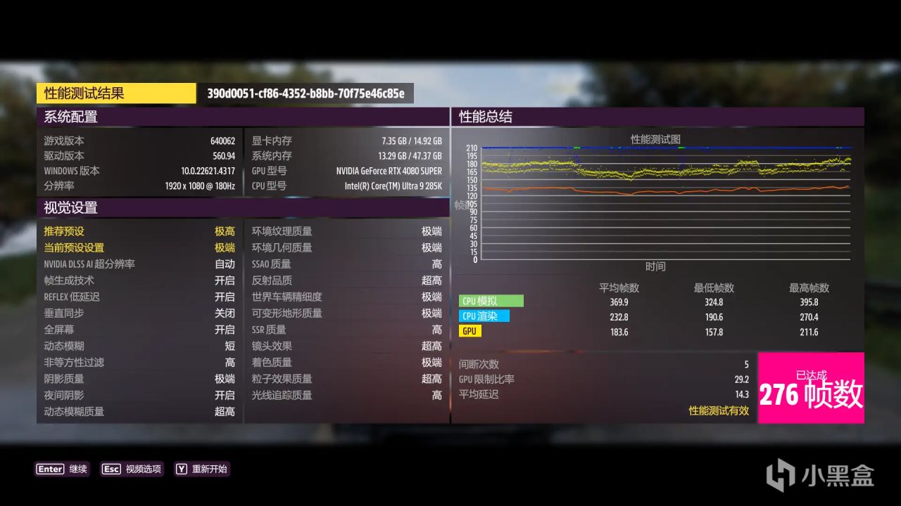 1080P+極高遊戲預設+DLSS 3.0自動模式,實測遊戲的平均幀數達到了276FPS。