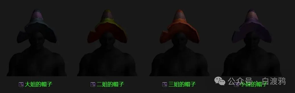 流程不長,但是跑路很遠,完成後有幾率從給的袋子裏開出以下:四個帽子幻化: