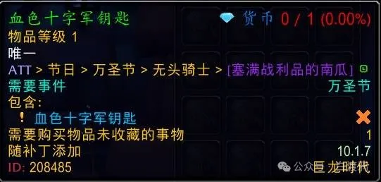 而如果你恰好從南瓜頭裏開到了道具【血色十字軍鑰匙】,就可以前往血色修道院解鎖60年代的老血色了。攜帶鑰匙,前往位於舊位面提瑞斯法林地的血色修道院,可以在大門廊入口處接到任務:古舊鑰匙鏈,點一下就可以完成。