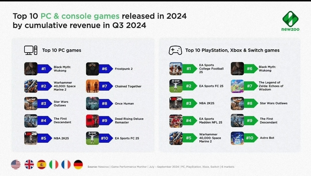 據外媒援引數據分析公司Newzoo消息,《黑神話:悟空》在今年第三季度表現強勁,位列歐美遊戲收入榜第五位。這是季度總收入榜單,還有其他細分領域,例如PC、主機、新遊等。