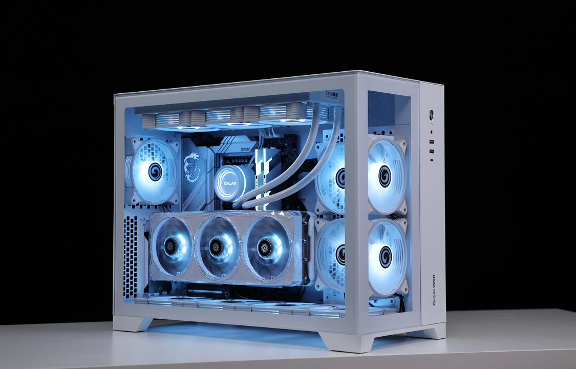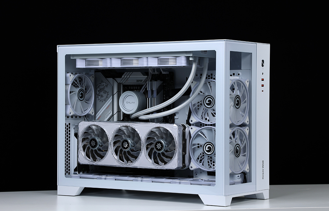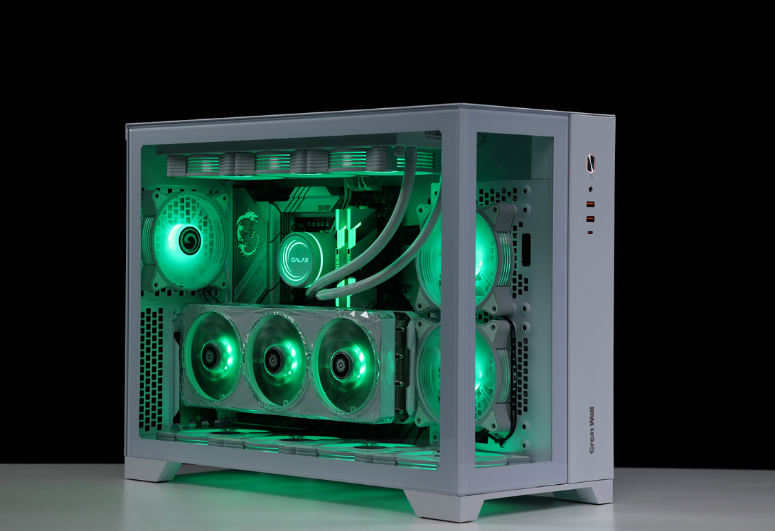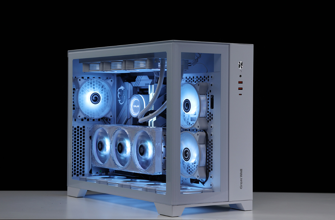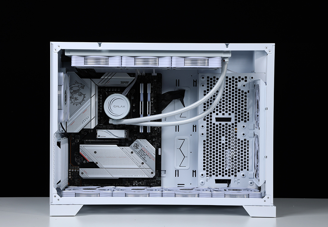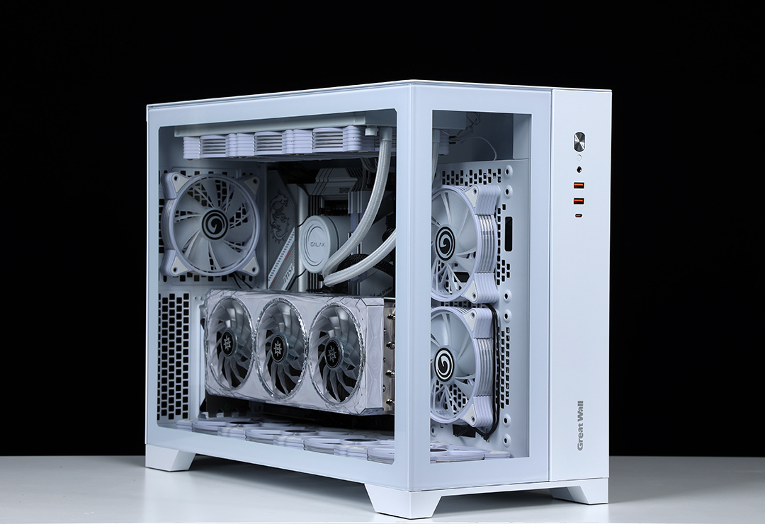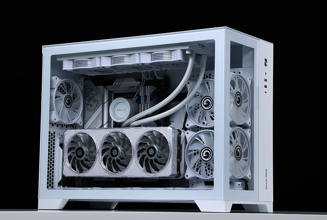 作为一款全塔机箱,T9W可以说特别能装。兼容E-ATX及一下全规格主板,显卡常规安装限长340mm(竖装状态下,400mm+的显卡都能轻松装下,机箱PCIE显卡槽位支持横竖装切换)。散热方面,机箱各侧均有大面积散热开孔,同时最大可支持13把12CM散热风扇安装,最大可顶置支持480冷排的安装;