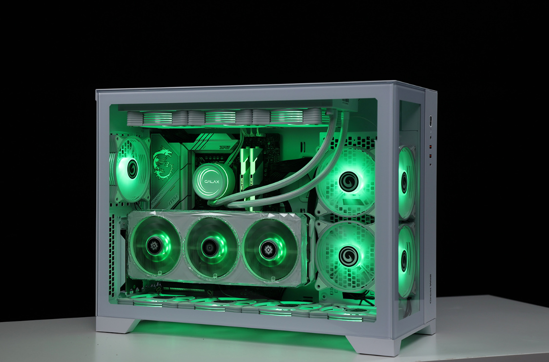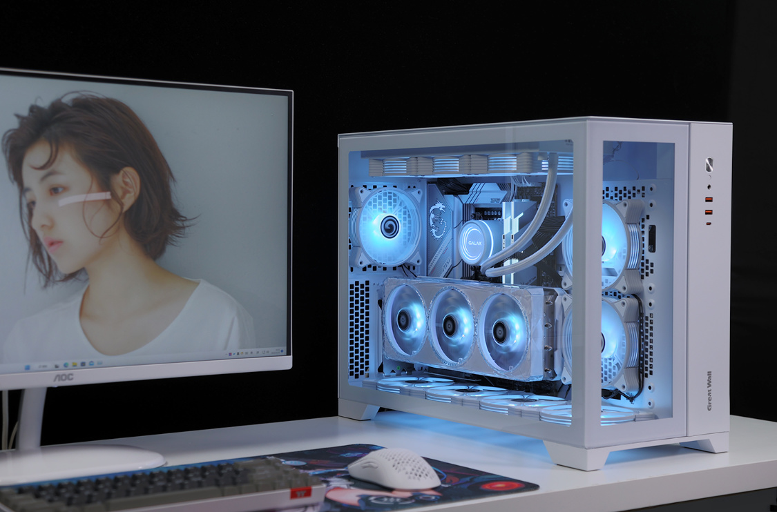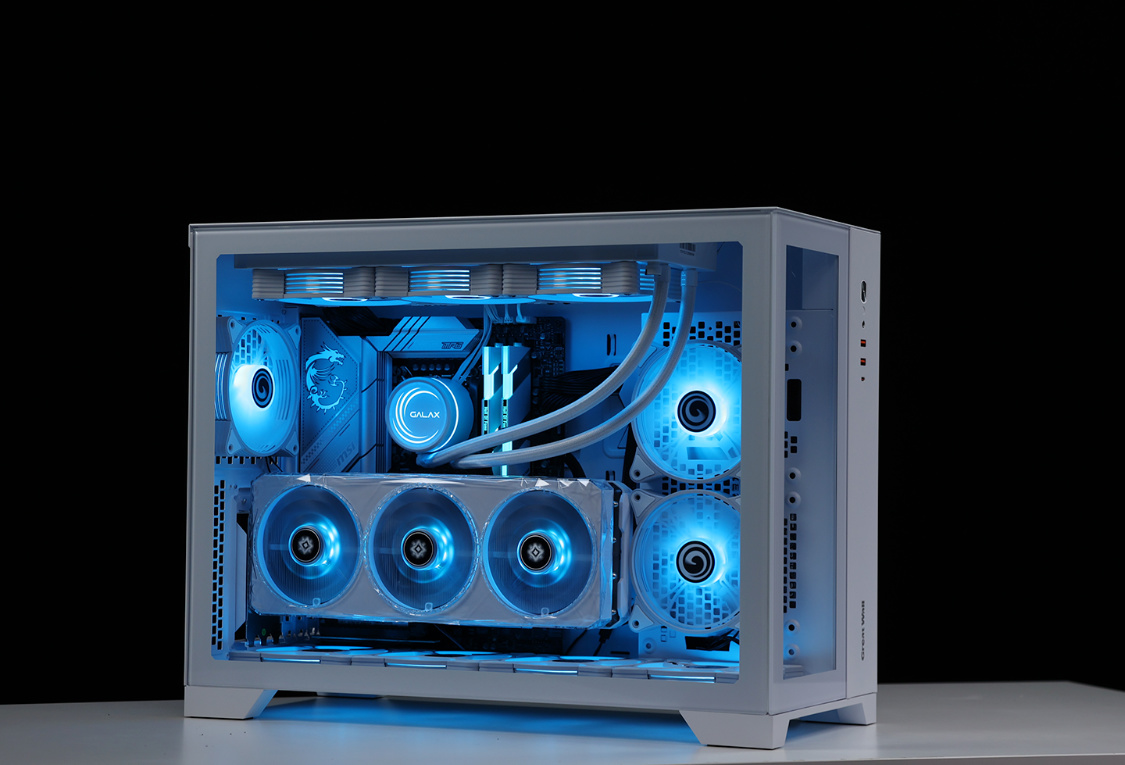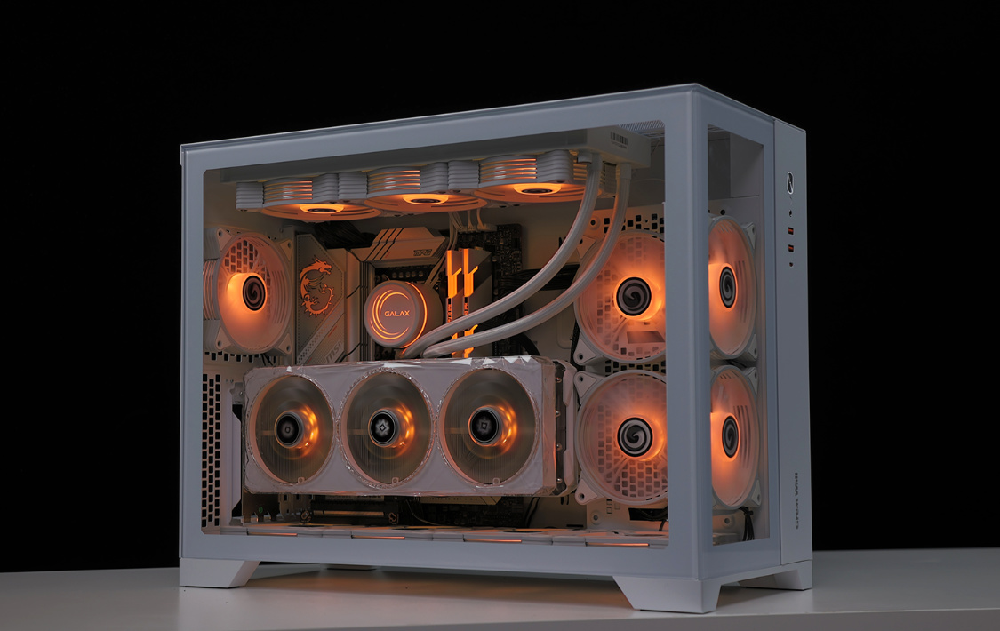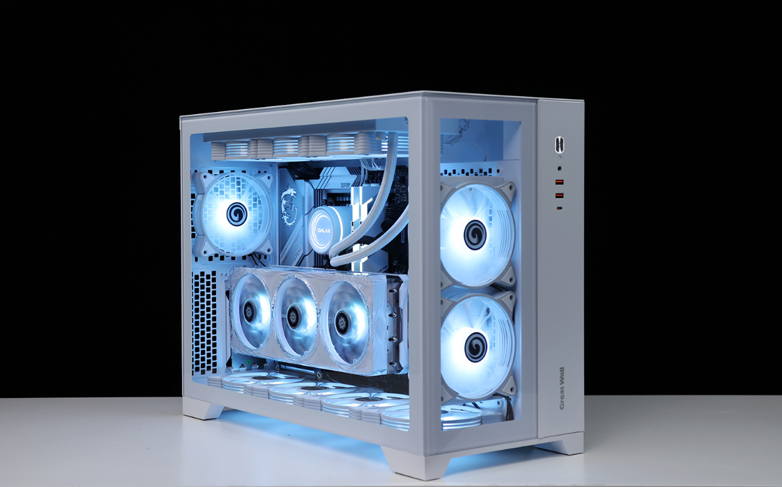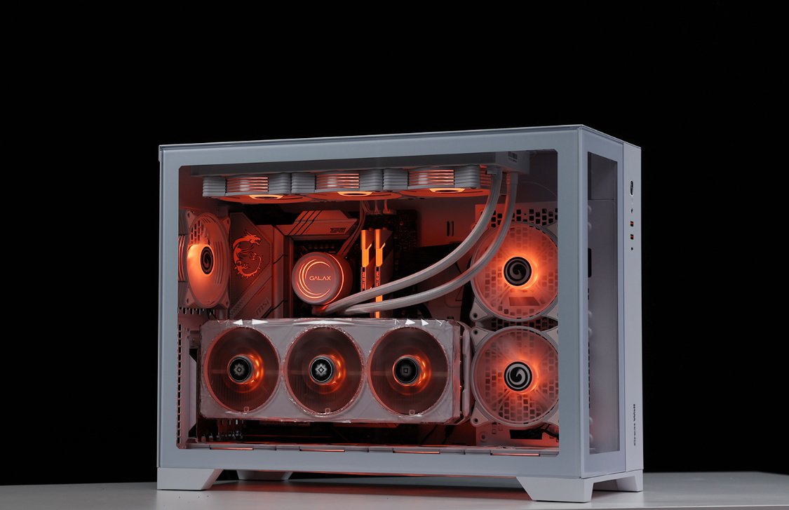 作为一款全塔机箱,T9W可以说特别能装。兼容E-ATX及一下全规格主板,显卡常规安装限长340mm(竖装状态下,400mm+的显卡都能轻松装下,机箱PCIE显卡槽位支持横竖装切换)。散热方面,机箱各侧均有大面积散热开孔,同时最大可支持13把12CM散热风扇安装,最大可顶置支持480冷排的安装;