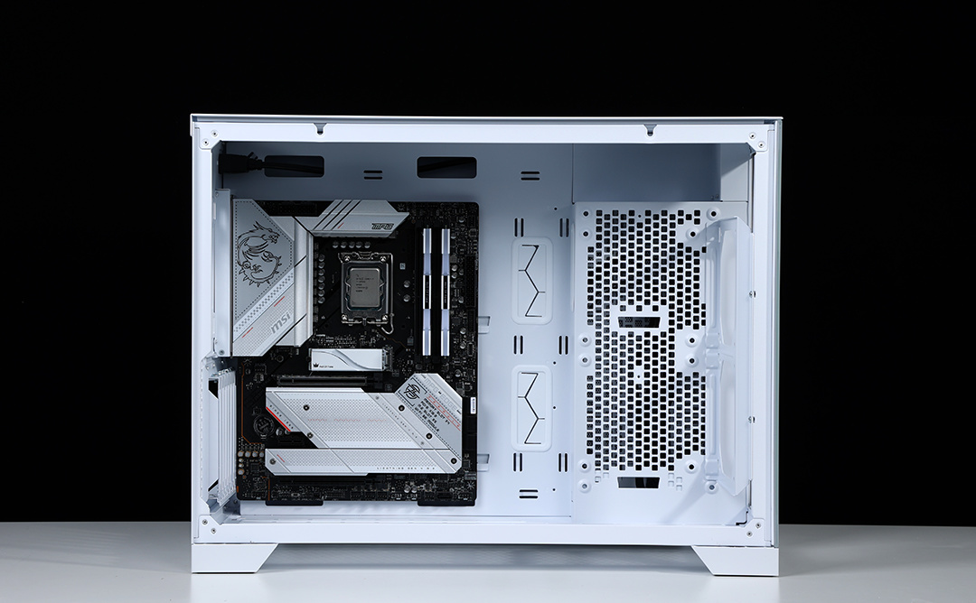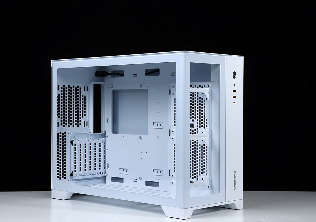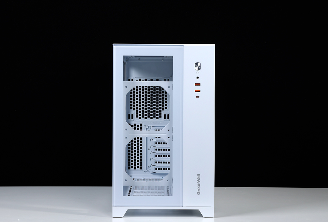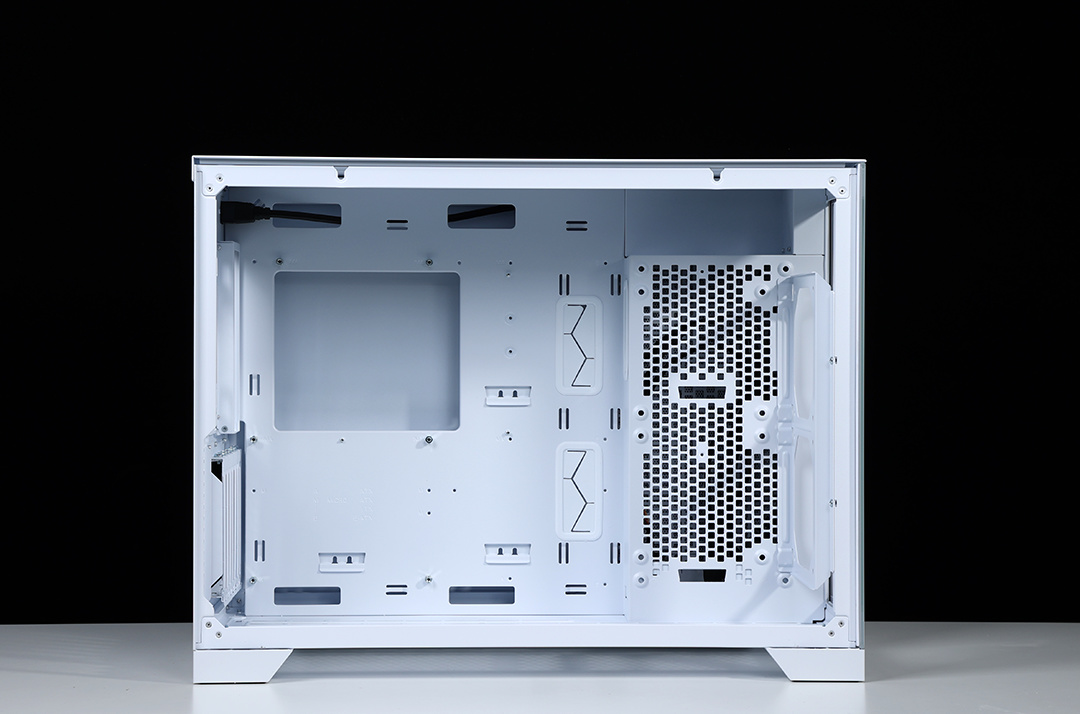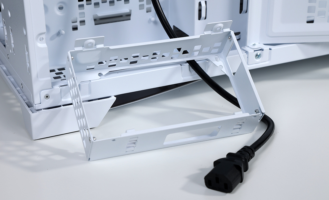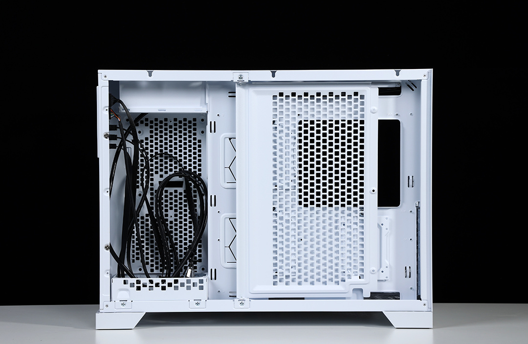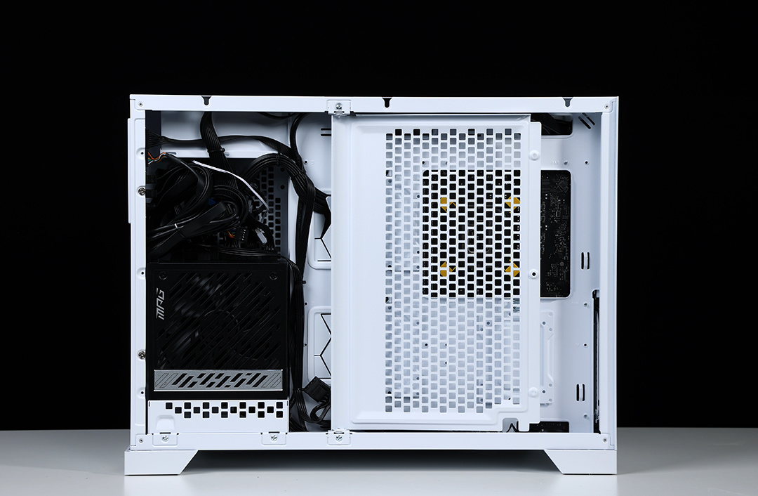 机箱配备独立电源仓,采用了前置的独特设计,需要搭配电源支架使用,电源仓正反面均有大面积散热开孔,可以更好的带出电源运行时产生的热量。充沛的空间,也便于走线时藏线。