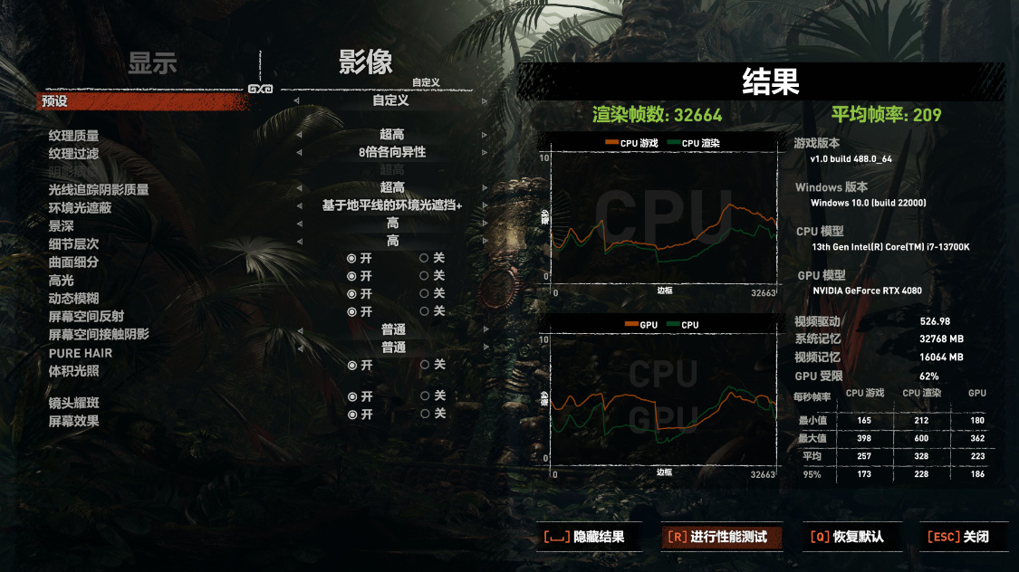 《古墓丽影·暗影》基准测试,画质最高,光追超高,DLSS超强性能,4K分辨率下,游戏平均帧率为209FPS;