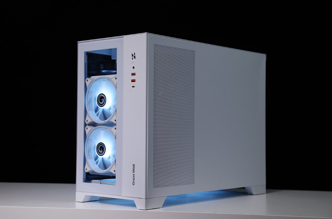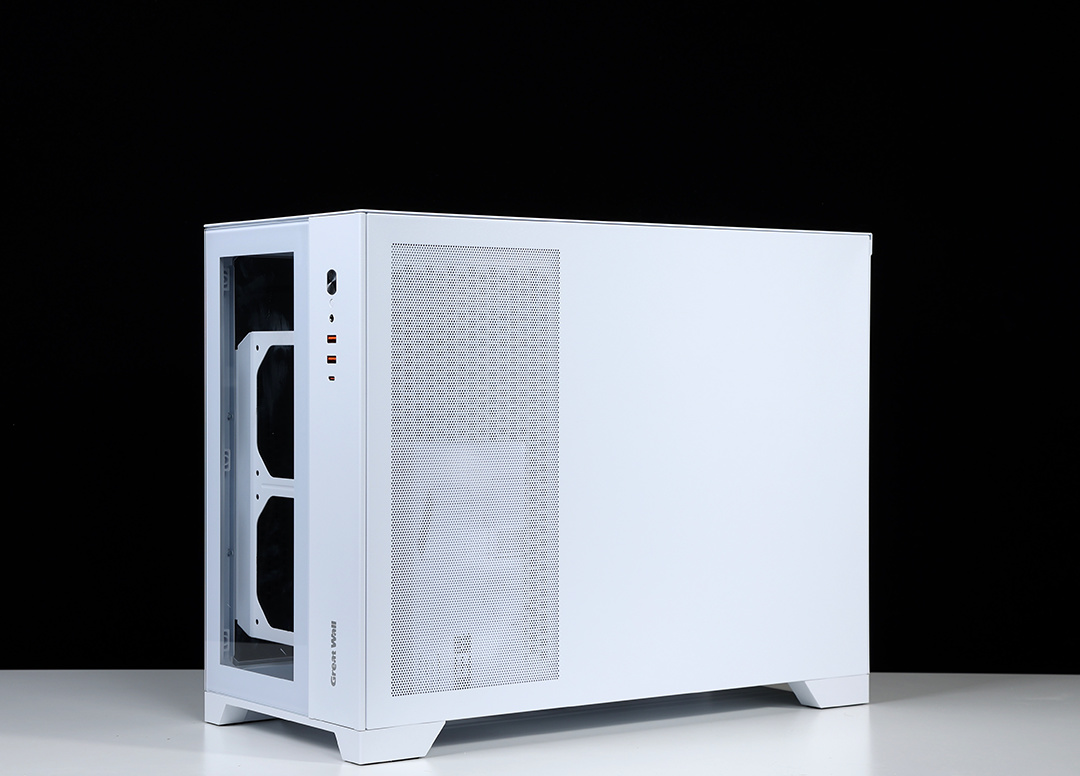 机箱前脸设计相对简洁,左侧大半部分是一块可拆卸钢化玻璃面板,另一侧则是机箱I/O面板,USB 3.0*2+USB 3.2 Typc-C*1的配置,也基本能满足日常存储拓展需求。机箱另一侧侧板采用全金属材质,靠前部分有大面积散热网孔设计;