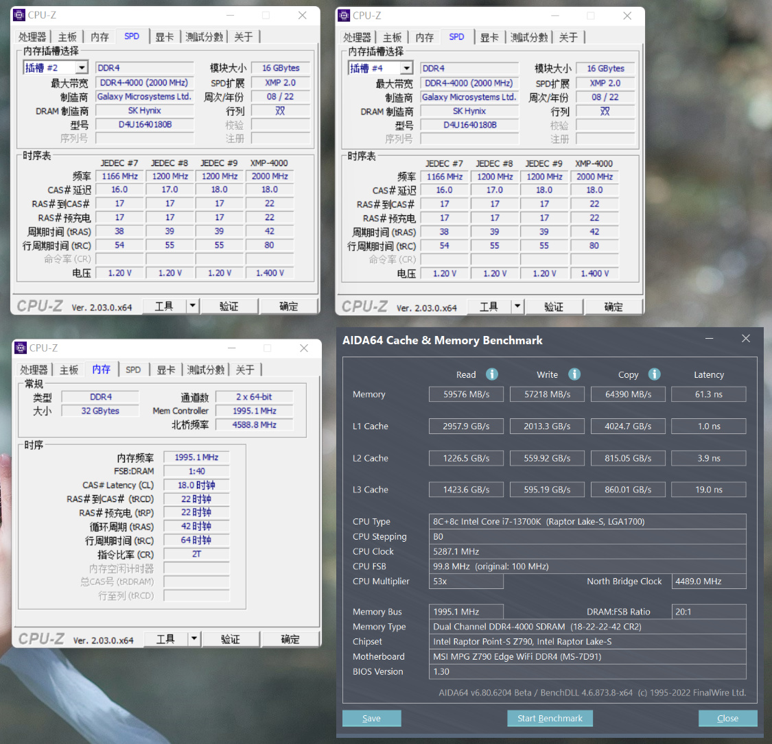 内存读写测试,开启XMP,锁 G1,内存读取速度为59576 MB/s,写入速度为57218 MB/s,复制速度为64390 MB/s,延时为61.3 ns;