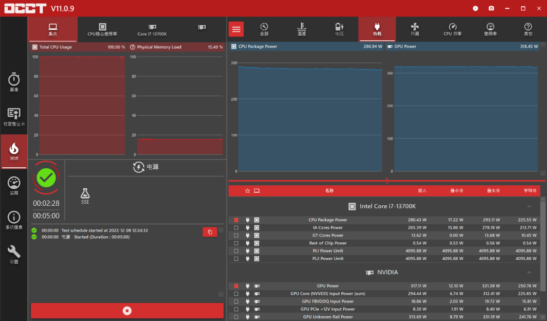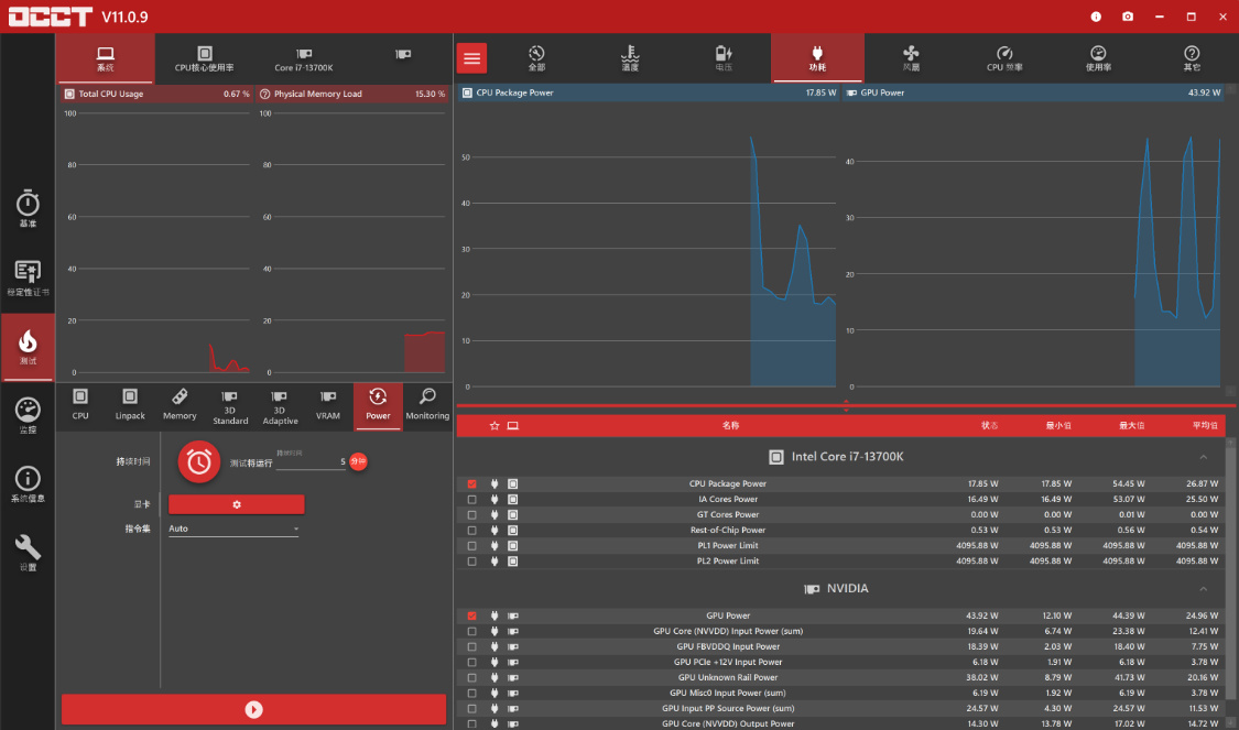 OCCT整机功耗测试,待机状态下,整机功耗在60W左右,使用默认设置,烤机5Min,整机功耗在600W左右;