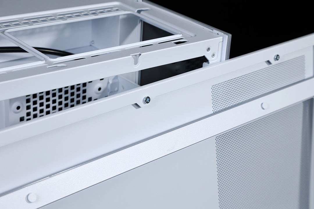 机箱采用卡扣式快拆设计,可以轻松免工具拆装。左右两块侧板通过卡榫结构固定,手拧固定螺丝拆除顶板后,向上轻提即可取下。