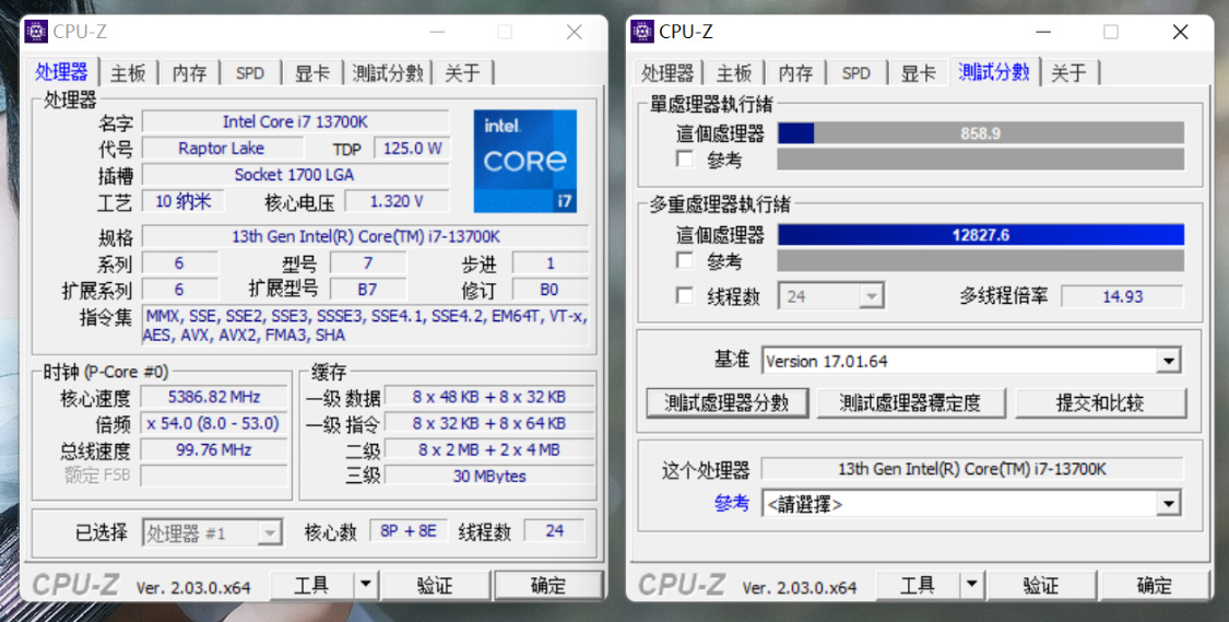 CPU-Z基准测试,自动睿频,单核得分858.9分,多核得分12827.6分;