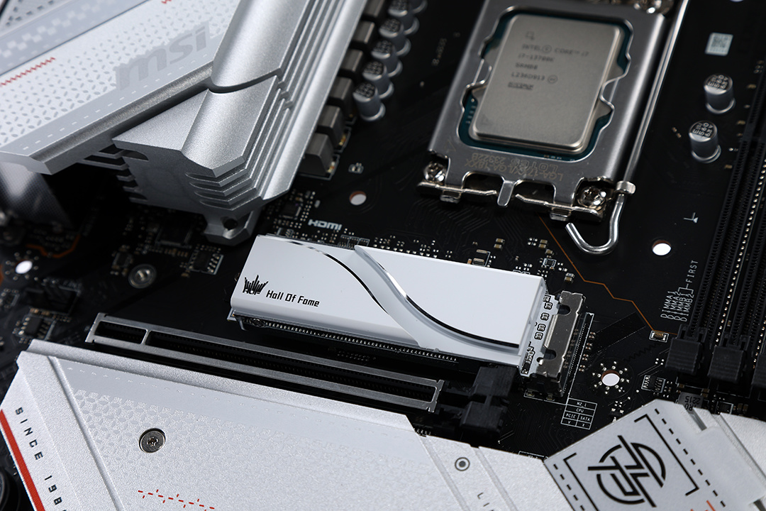 主板配备三条显卡PCI插槽(PCIE X16*2 +PCIE X1)仅CPU插槽支持PCIE 5.0 X16。此外,主板配备了5个M.2硬盘位,且均支持pcie4.0高速传输。今天装机也直接选择了一块自带高颜值白色散热马甲的影驰HOF Pro30 2T M.2固态硬盘。2T的大容量,也能更好的满足时下3A大作的存储需求;