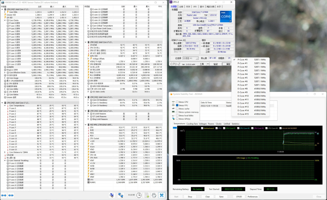 室温26°,机箱内环境,AVX OFF,CPU功耗在240W左右,CPU封装温度在92°左右;