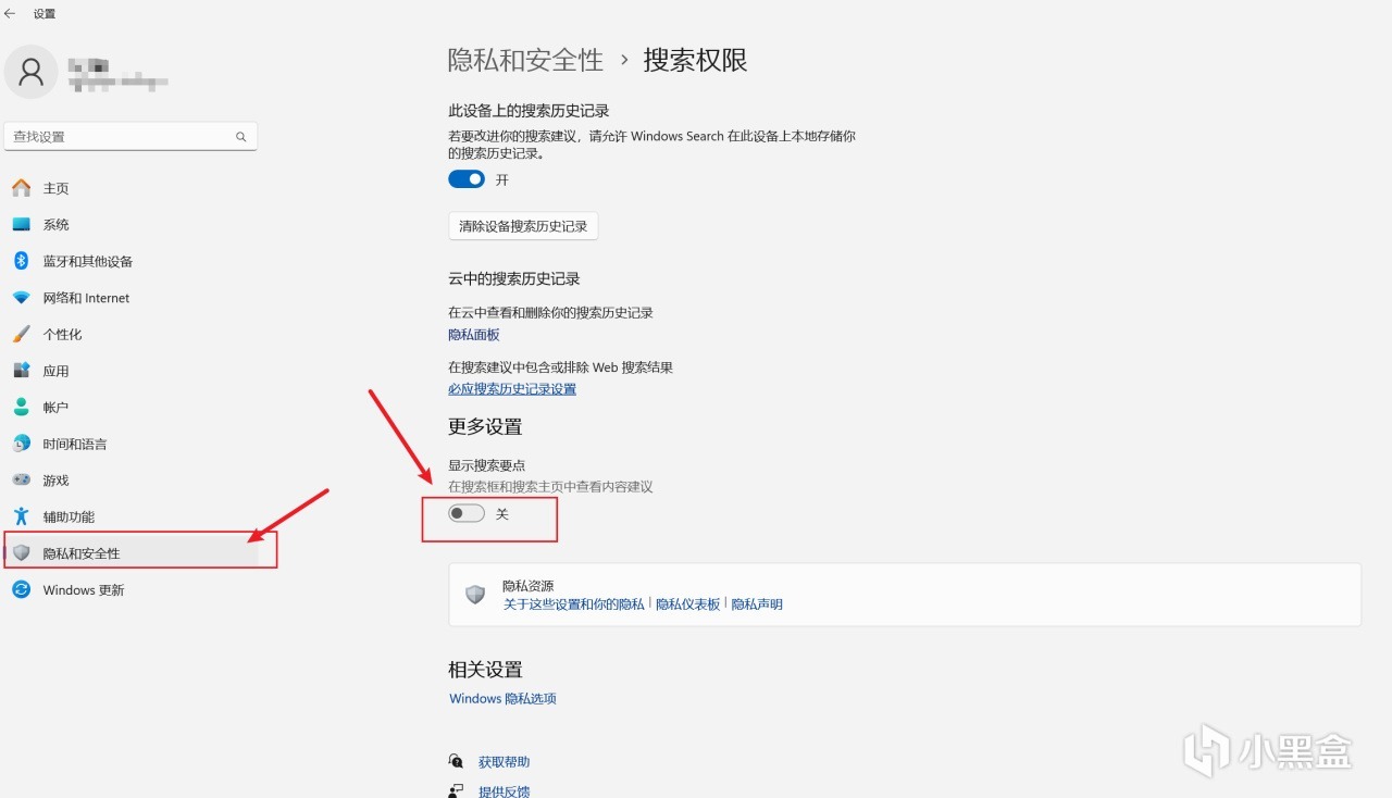 關閉搜索權限: 打開設置【快捷鍵Win+I】– 隱私和安全性– 搜索權限