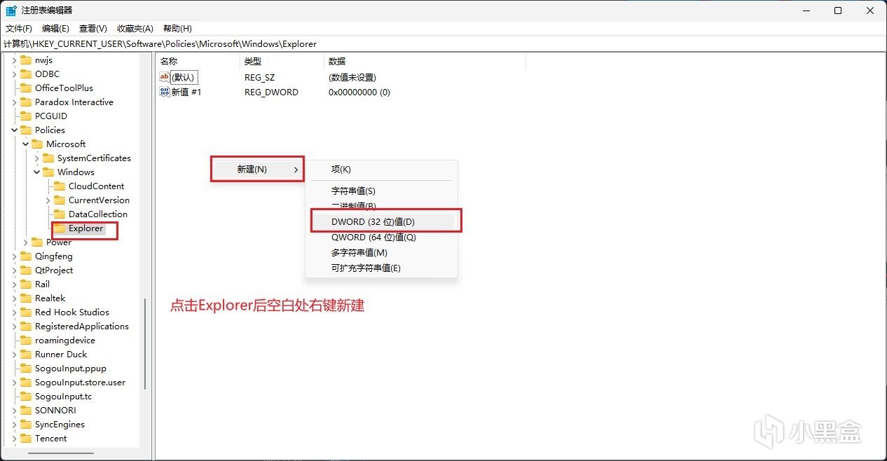點擊Explorer後空白處右鍵新建 DWORD(32)
