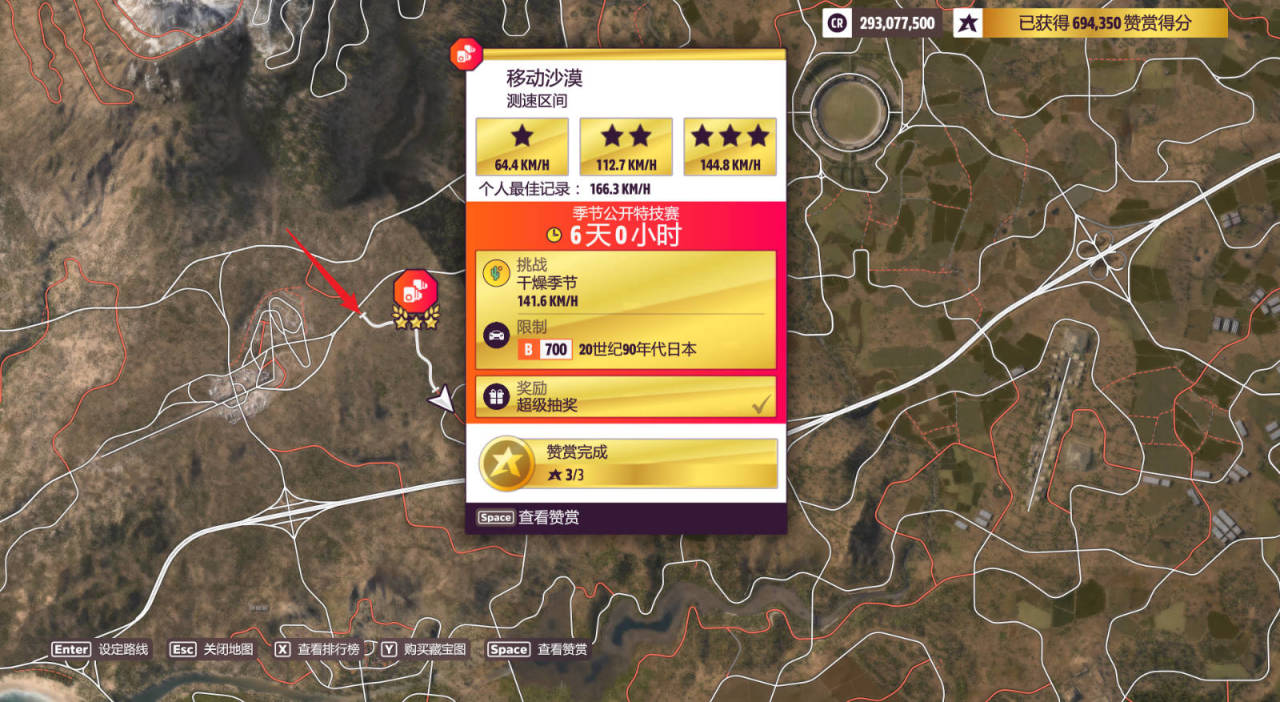測速區間:移動沙漠,完成獎勵爲超級抽獎。(建議從上面入口出發,注意過彎儘量鬆油門不要剎車,測速區間道路允許在跑的時候出界一點點,不會判定你失敗)