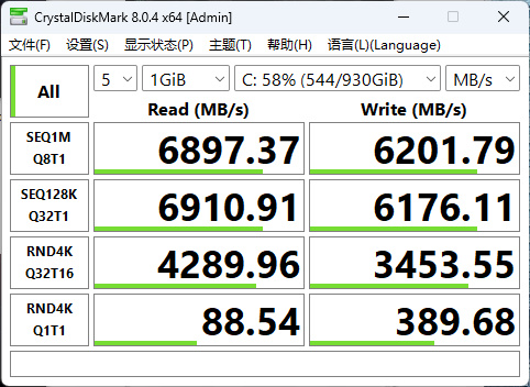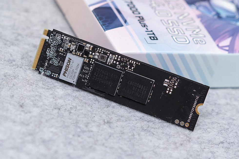 揭開體質可以看到,採用 Phison PS5027-E27T、PCIe 4.0 主控,支持第 4 代 LDPC & RAID ECC 糾錯能力,以及 TRIM 指令和 S.M.A.R.T 自我檢測分析報告技術。支持的最高讀取速度爲7400 MB/s,最高寫入速度爲6400 MB/s。閃存NAND顆粒則是自封形式的,標註型號爲T27HGA5A1V,官方標稱寫入壽命上限爲600TBW。