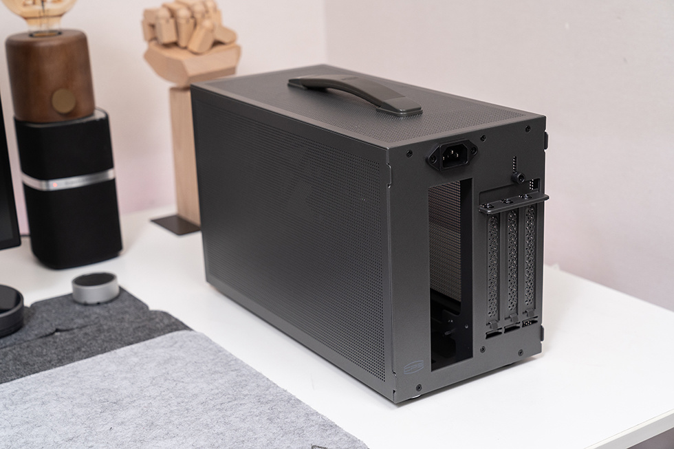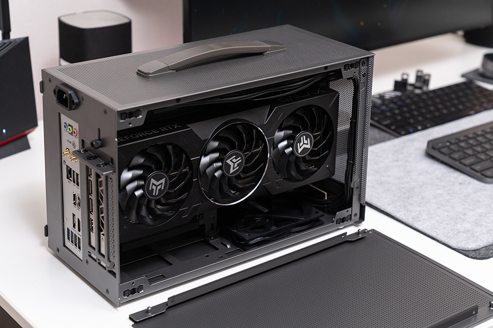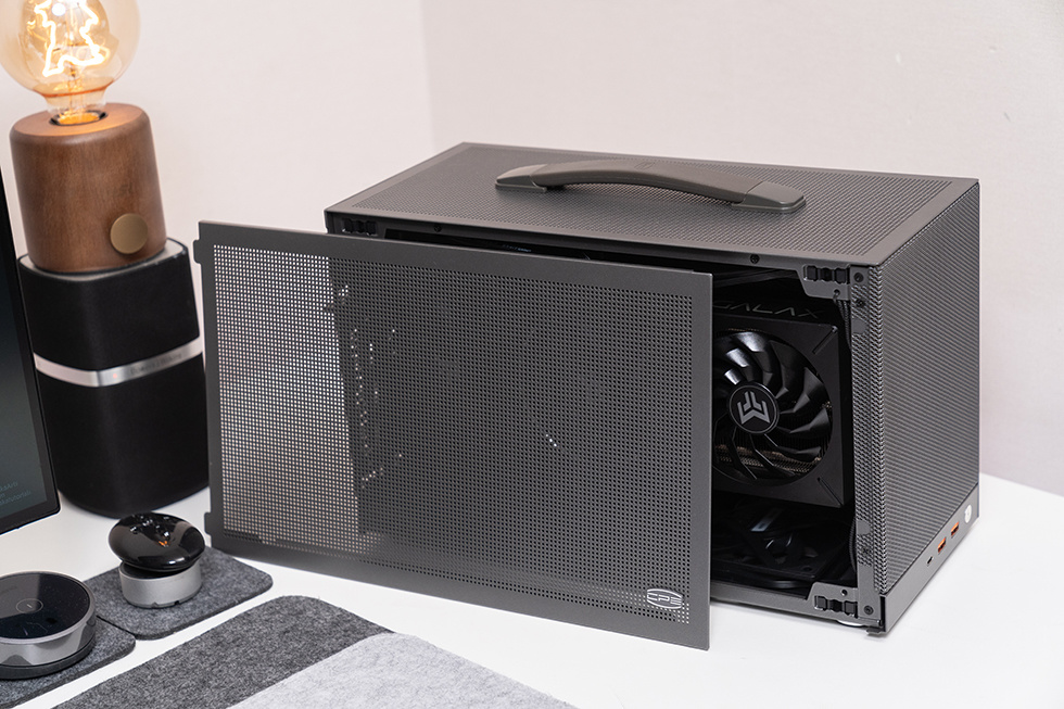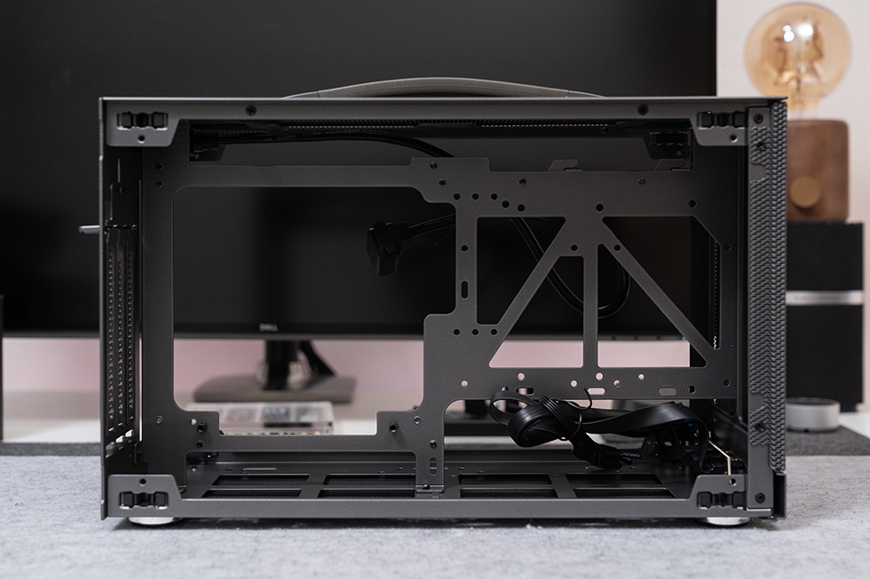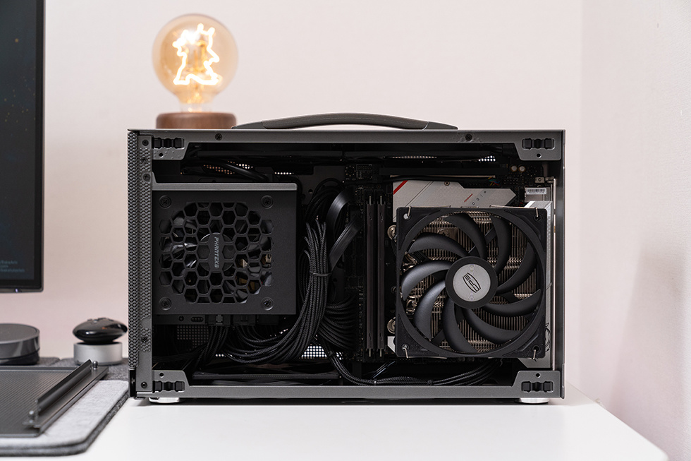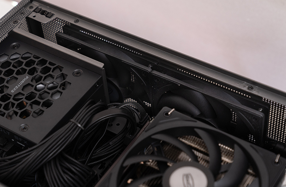 機箱左側爲電源和主板安裝區域,在裝下ITX主板和SFX電源的情況下上下還支持各安裝2把12015規格的薄扇,通過PCI-E延長線與背面的顯卡連接。