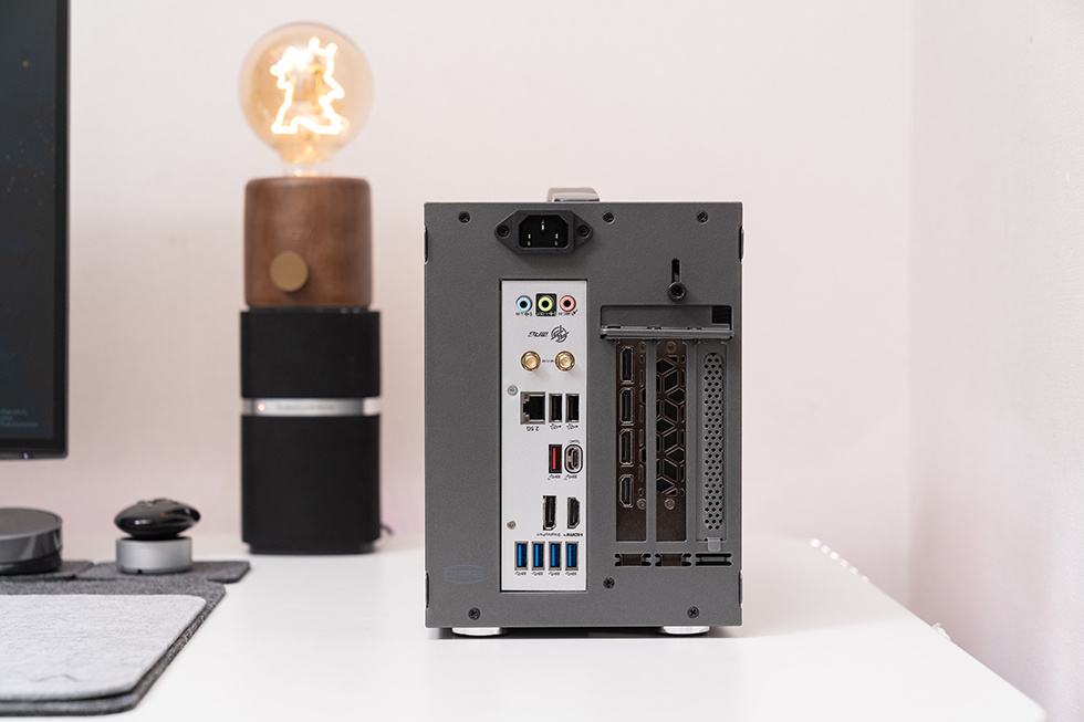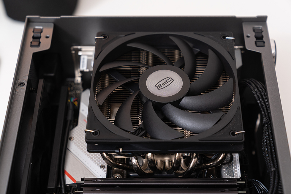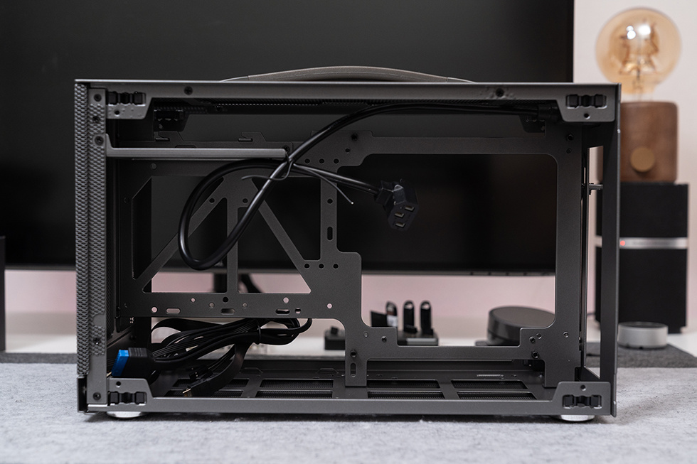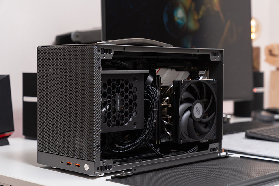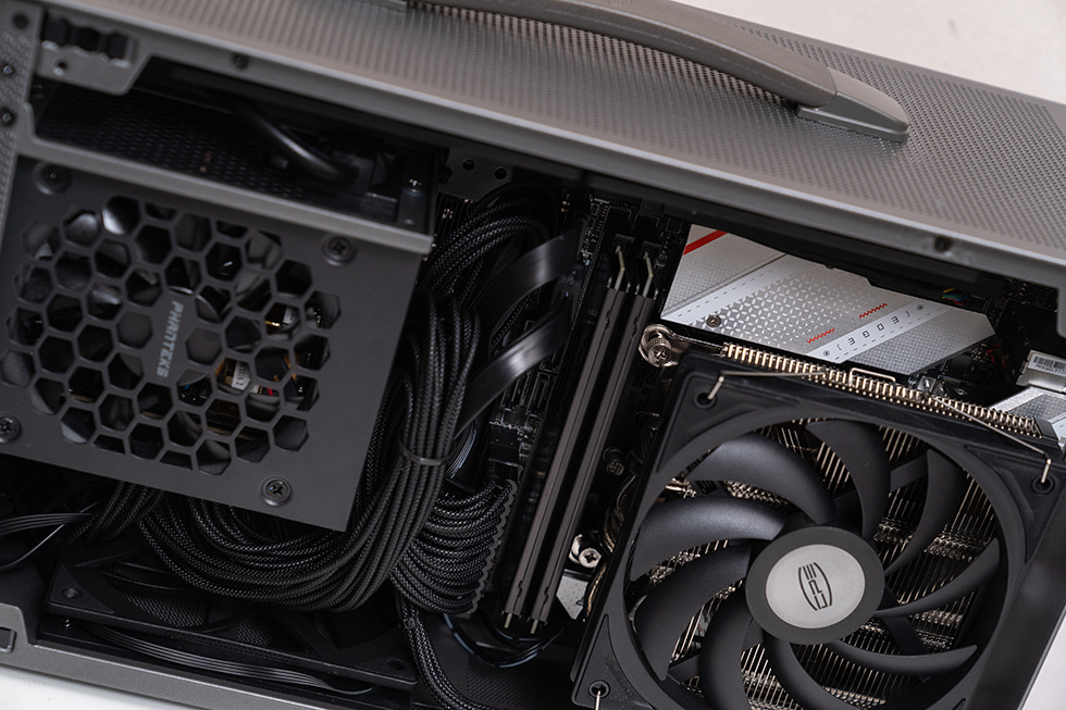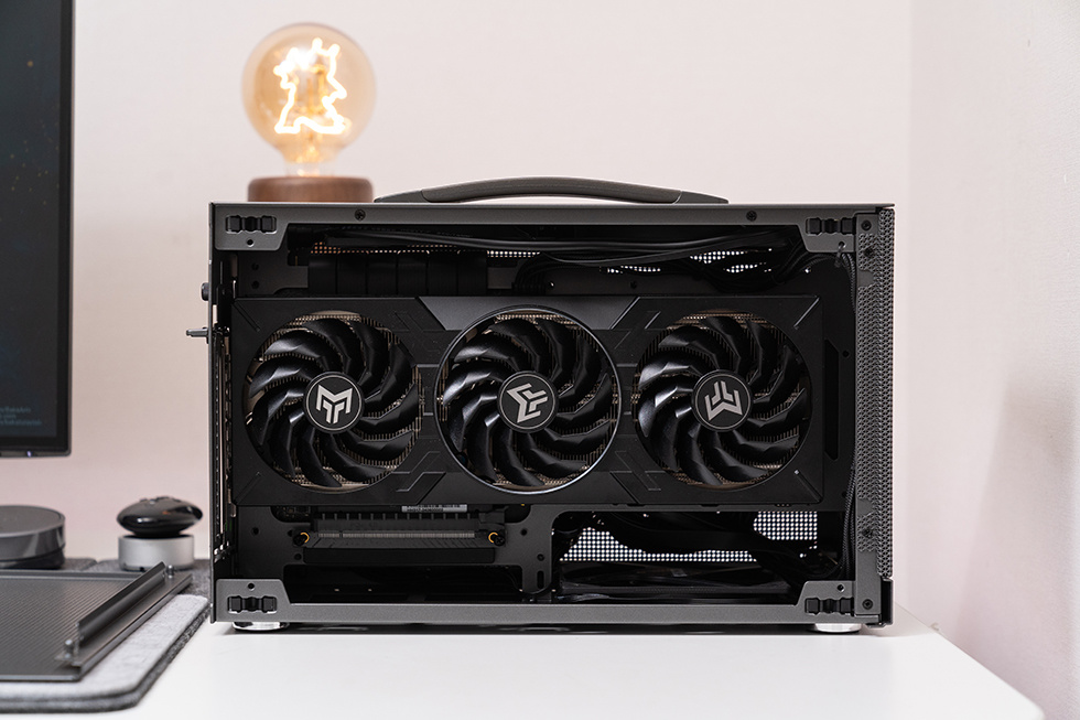 機箱左側爲電源和主板安裝區域,在裝下ITX主板和SFX電源的情況下上下還支持各安裝2把12015規格的薄扇,通過PCI-E延長線與背面的顯卡連接。