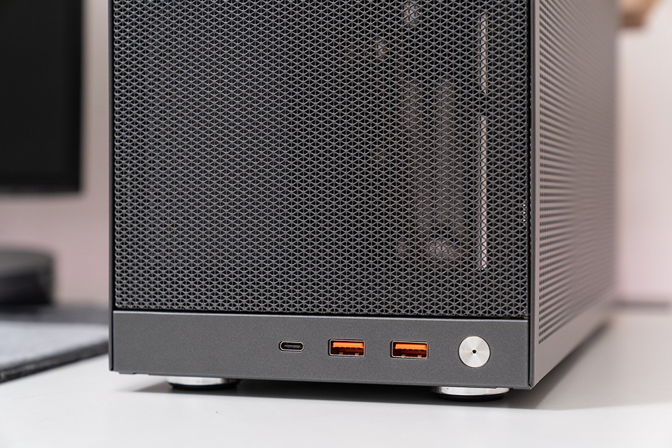 機箱IO面板佈置在機箱正面底部位置,面板爲純鋁材質,從左到右依次爲1個type-c,2個USB3.0和一個電源開關。