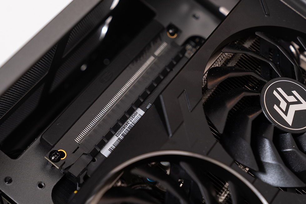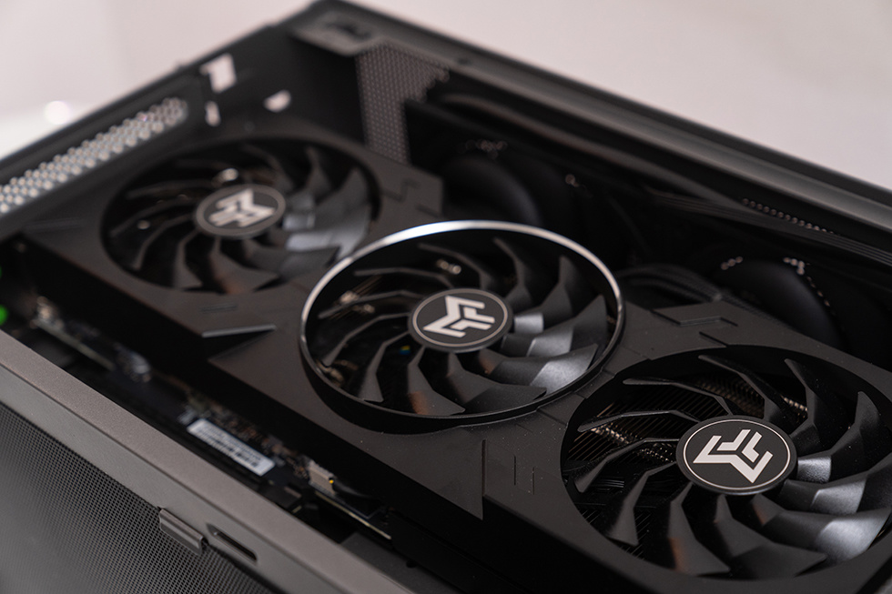 右側的顯卡安裝位,支持最長340mm,厚度爲65mm規格的顯卡,所以目前主流的40系顯卡均可以輕鬆入庫。本次選擇了影馳 GeForce RTX 4070 金屬大師B OC,全黑無光設計,金屬外殼極具質感,配置了3個規格爲92mm超大靜霜風扇,確保穩定散熱。