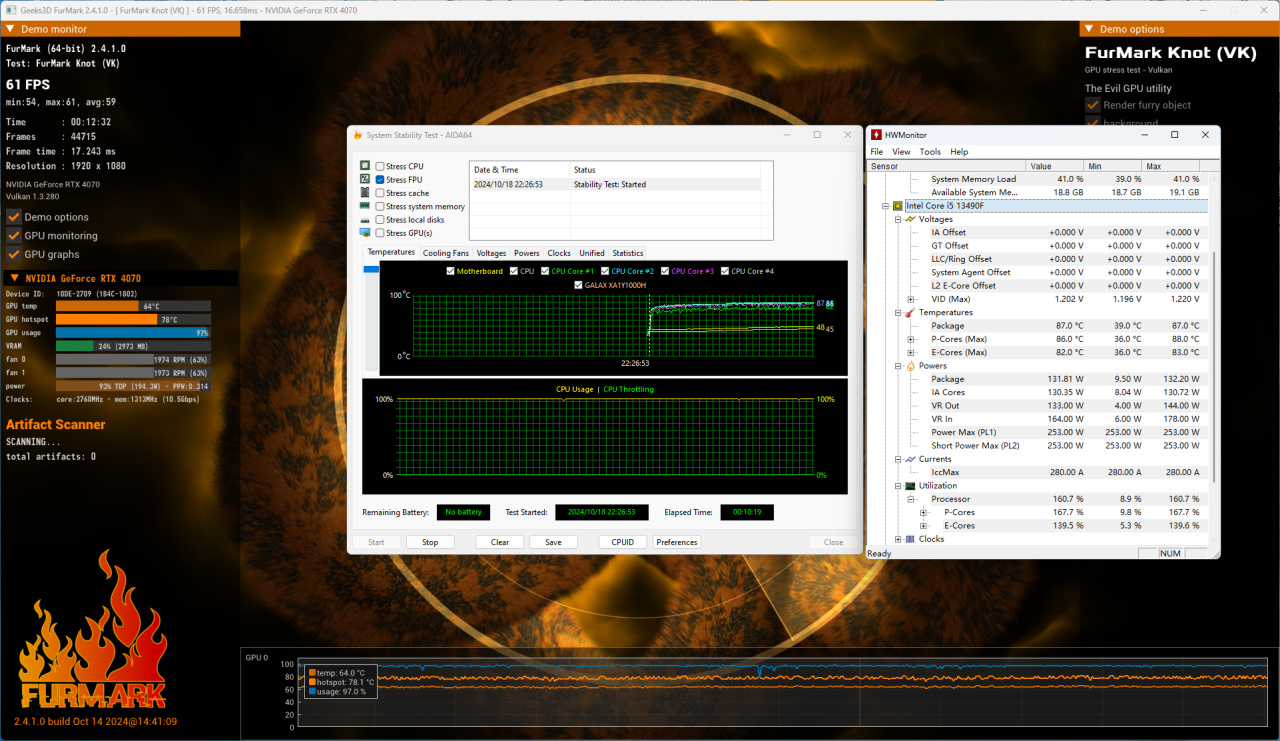 首先看一下雙烤的溫度,開啓OFFSET模式,CPU功耗132W,最高溫度87℃,顯卡溫度64℃。