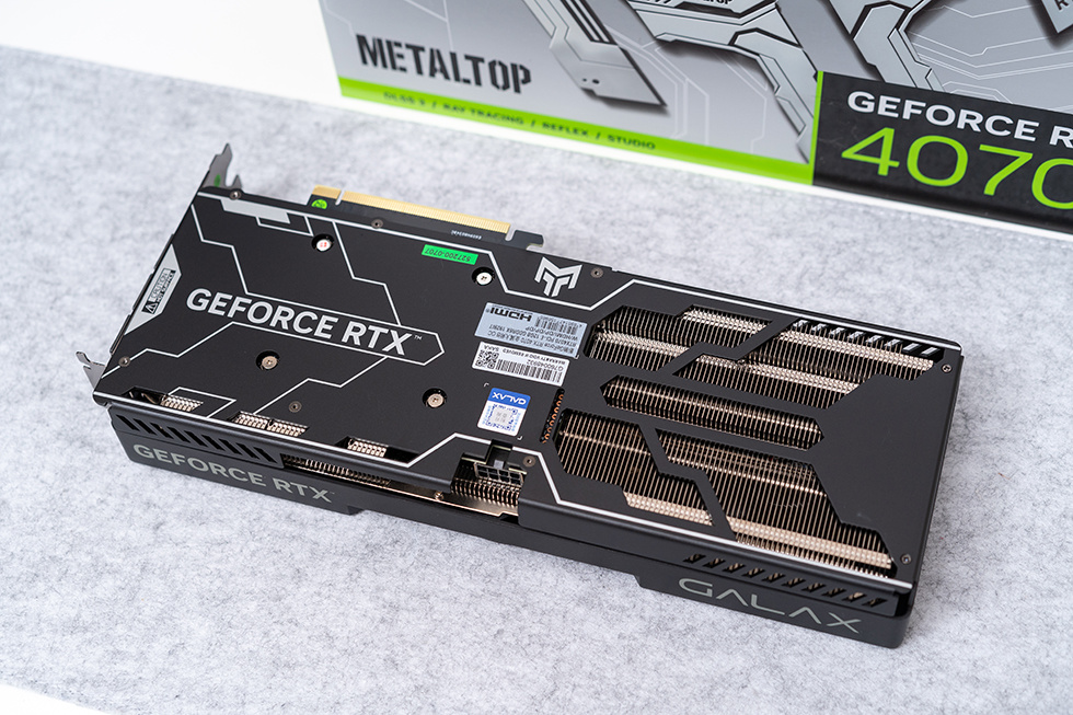 影馳 GeForce RTX 4070 金屬大師B OC顯卡的爲全金屬的設計,背板中間的GEFORCE RTX logo和金屬大師裝飾紋,介於PCB版型短,右邊則爲大面積鏤空散熱設計,散熱鰭片排布工整,有效增加散熱效能。