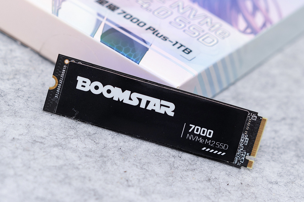 正面的定製散熱片採用了專屬高效複合材料,上面印有星曜系列的英文名“BOOMSTAR”,保持SSD快速散熱,高效運行。