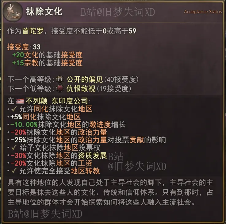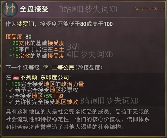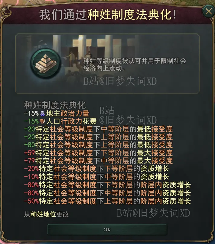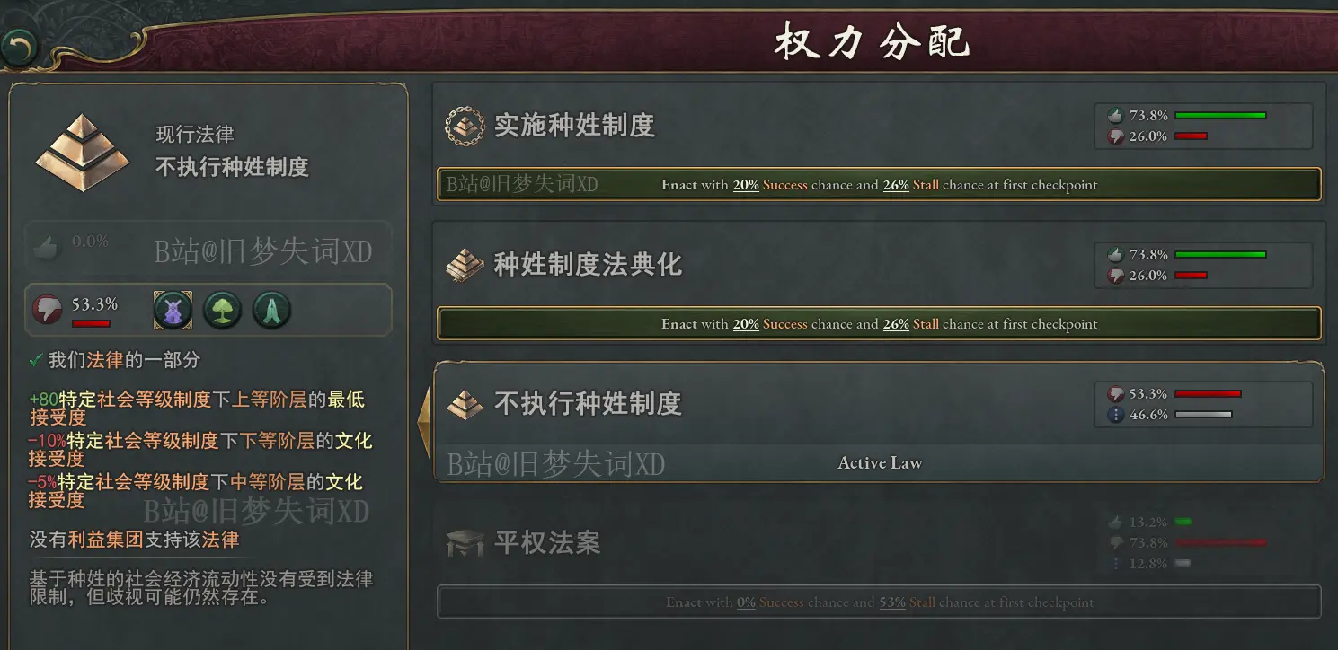 該法律組效果只對隸屬於種姓制度下的人羣生效。比方說圖片展示的對特定社會等級制度下的上等階層提高80最低接受度。也就是說該效果只對屬於上等階層的婆羅門生效,對於其他等級的人羣沒任何影響。