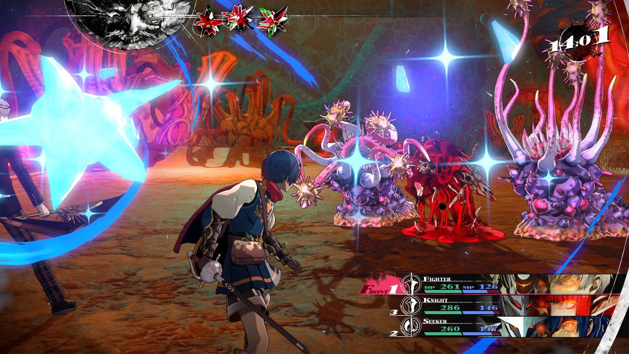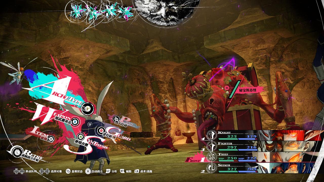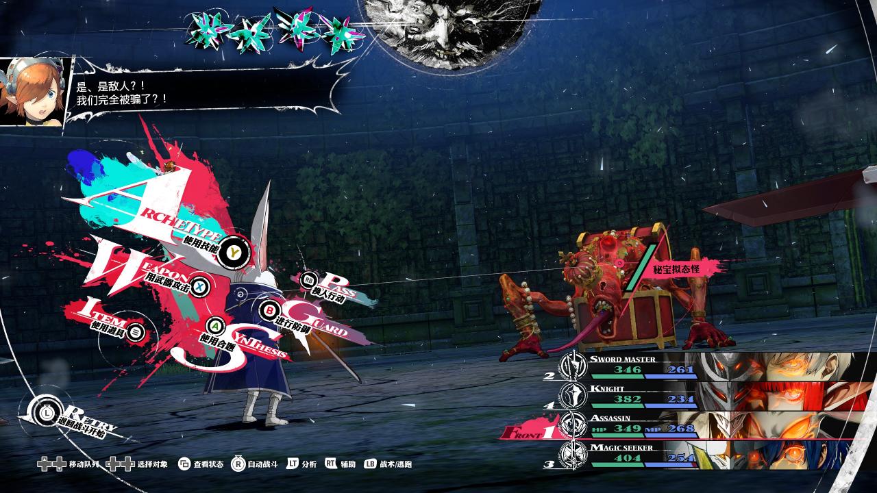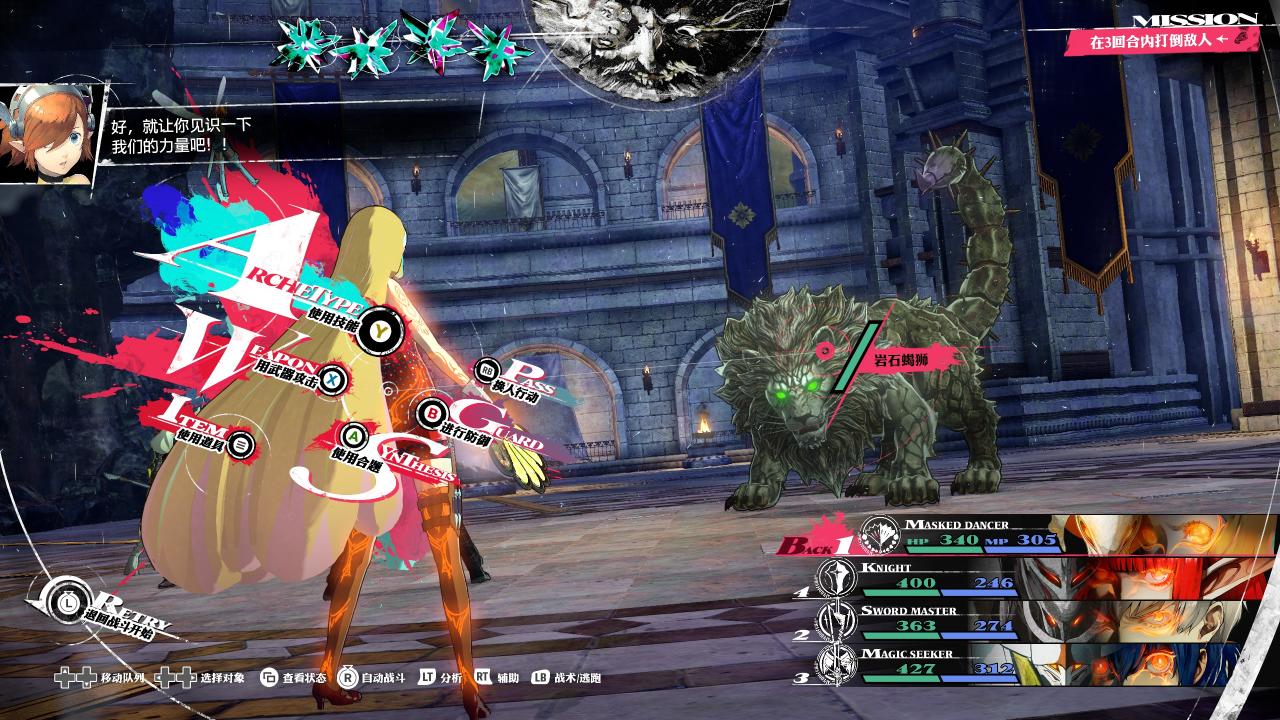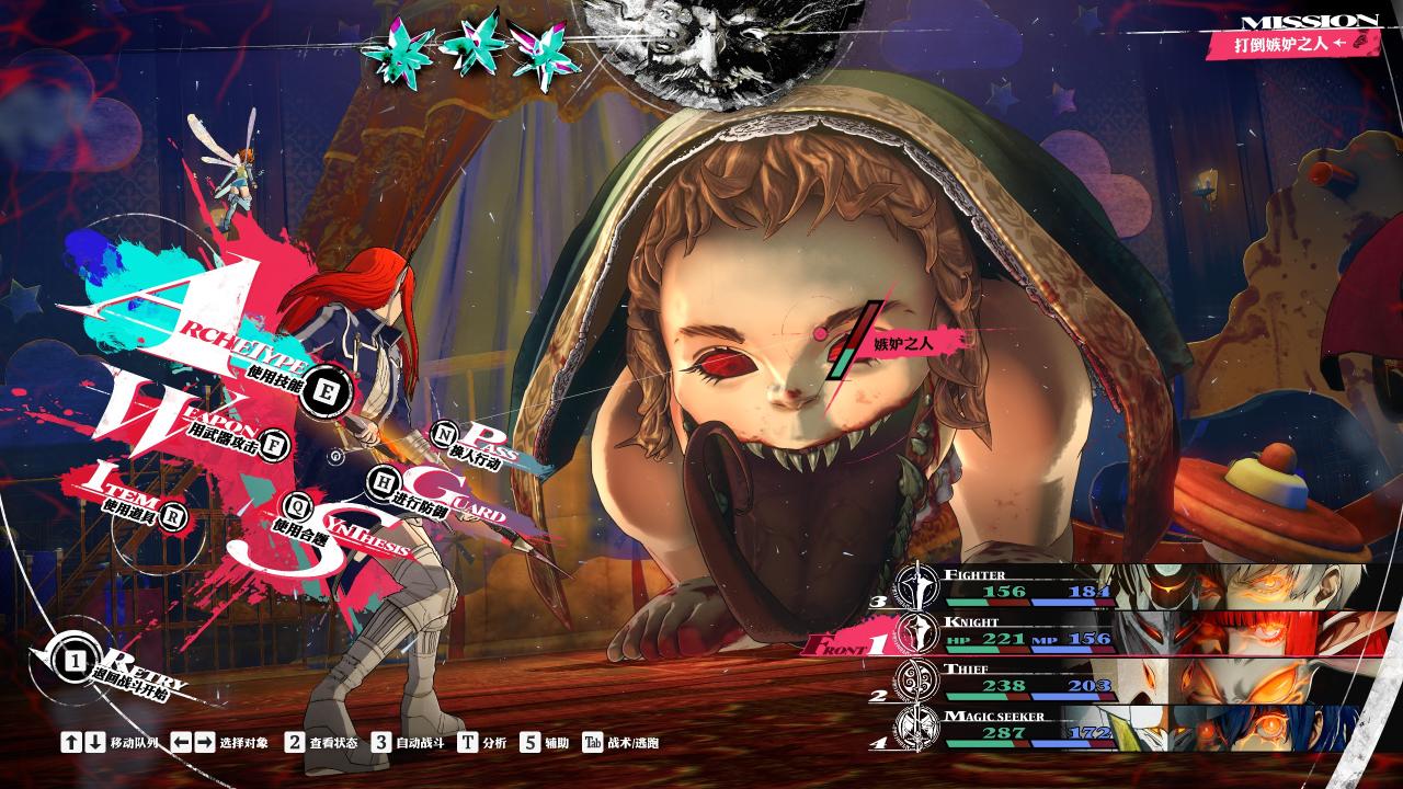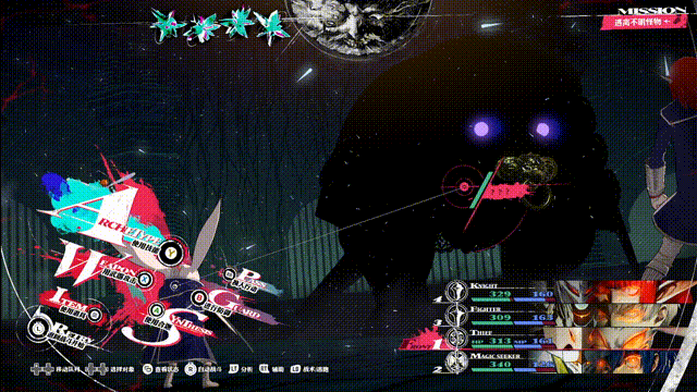 不過在相似度上比起《P5R》,其核心機制更傾向於《SMTVV》,最爲顯著的元素則是屏幕左上方的星星行動點,用於釋出戰鬥指令,如: