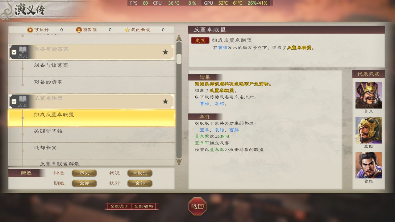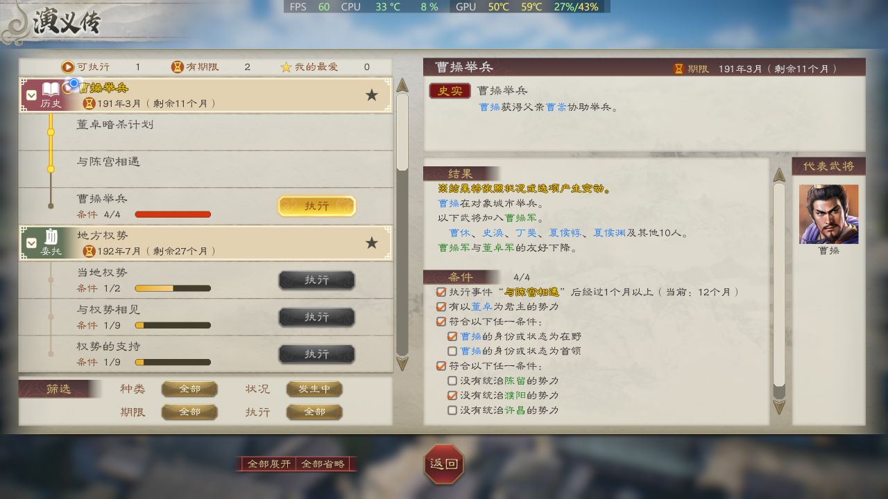 结果剧情发展到曹操刺杀董卓失败遇到陈宫之后,就一直没动静了,赶紧查看一下,原来有两个条件不符合:曹操身份不是在野或者流浪军首领,而且能作为根据地几个城市都人被占了。