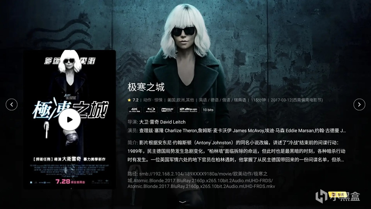 ▼点击影片进入详细页面,沉浸式的焦点卡片配合影片大背景海报展示方式相当醒目、片名、海报、打分、简介、视频格式、编码、音轨一应俱全,下滑可以调出演职人员、相关影片等等。