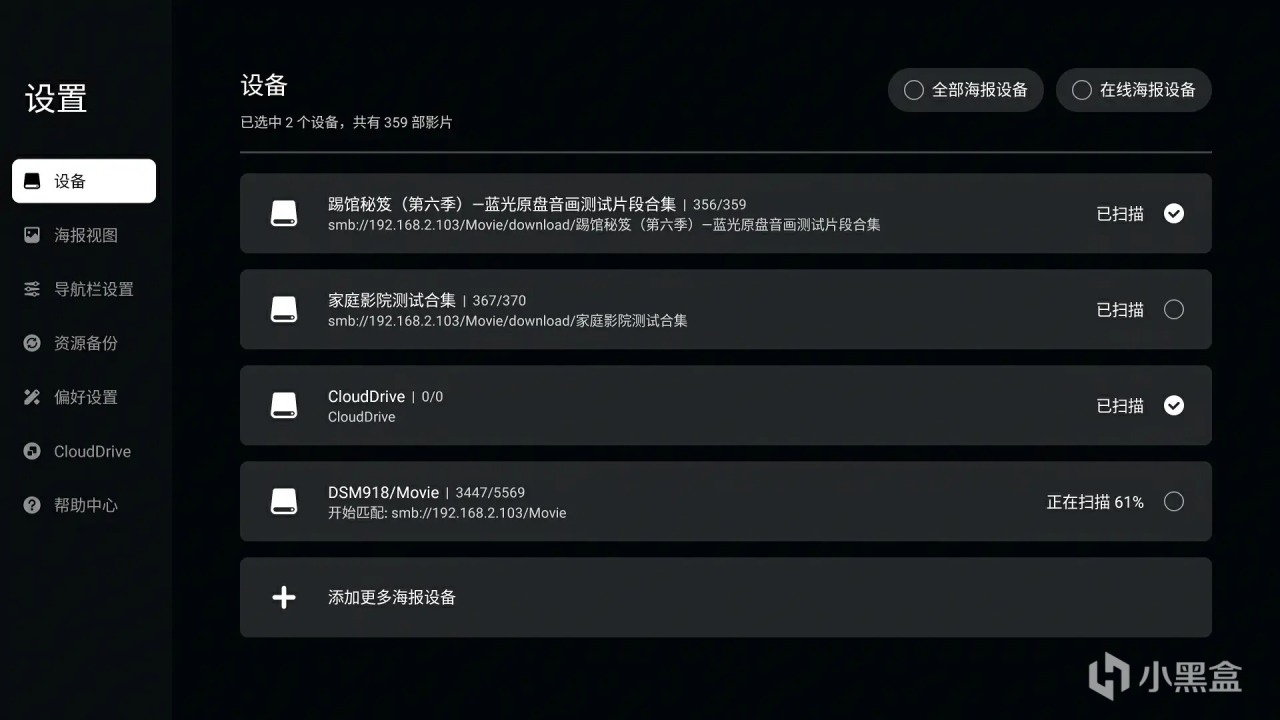▼挂载好以后,设备栏添加 CloudDrive ,选择对应的网盘就会自动进行刮削,影片资料也会同步导入影视库,实现更便捷的蓝光在线播放方式