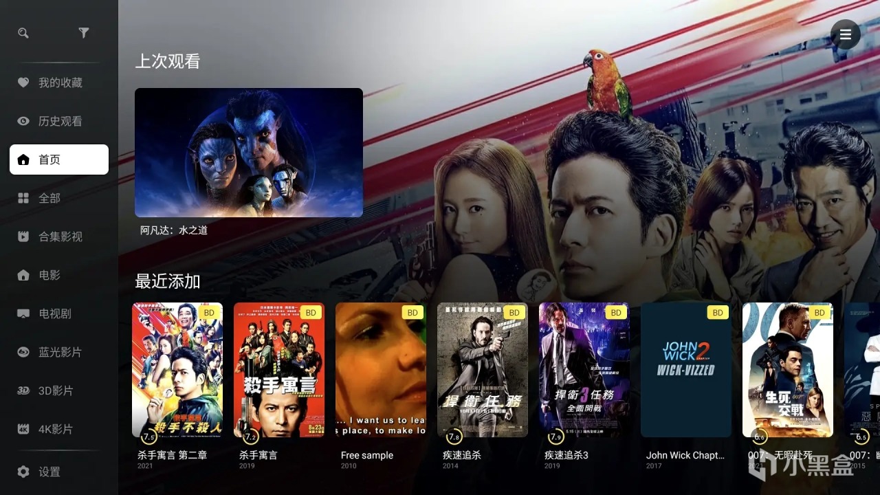 ▼先来看看主界面,这是我已经导入了片源的场景。影视库采用直观的侧边导航设计,左侧分类,右侧影视墙,观影记录、最近添加,整体排列有序,一目了然。