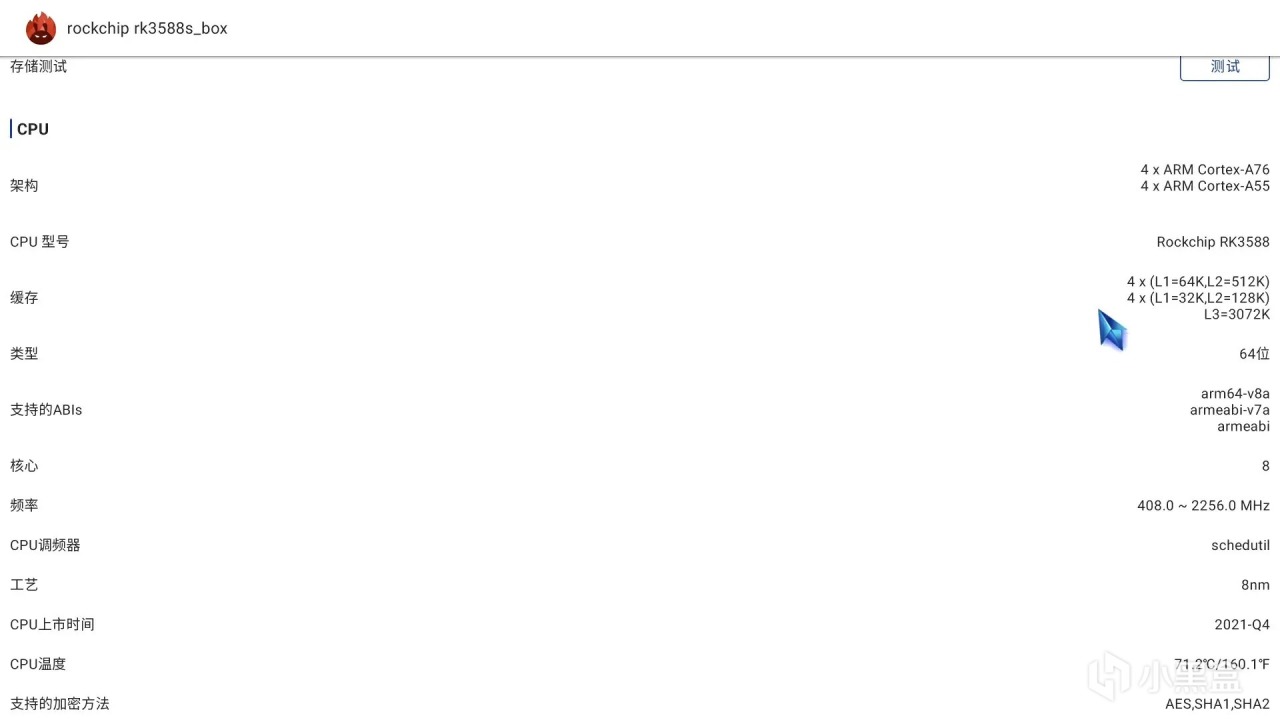处理器为瑞芯微 RK3588S 处理器, 8nm LP 制程,搭载 八 核 64位 CPU,四 核 Cortex-A76 + 四 核 Cortex-A55 架构,主频 2.4GHz,